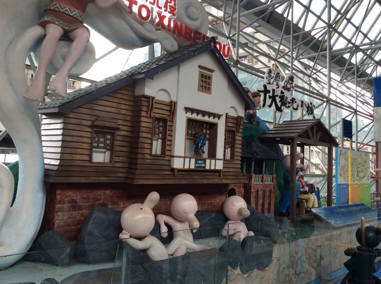 私も新北投に行くためにホームを乗り換えるが、誰も間違いようが無いくらい、プラットホームには温泉を彷彿させるオブジェなどが溢れている。