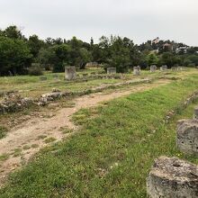 アクアポリスの後に歩いて古代アゴラに行きました。アッタロスの柱廊とヘファイストス神殿が見どころで、あとは原っぱのような場所です。この中央柱廊はかつて市場だった場所だそうですが、今は礎石が少し残っているだけです。