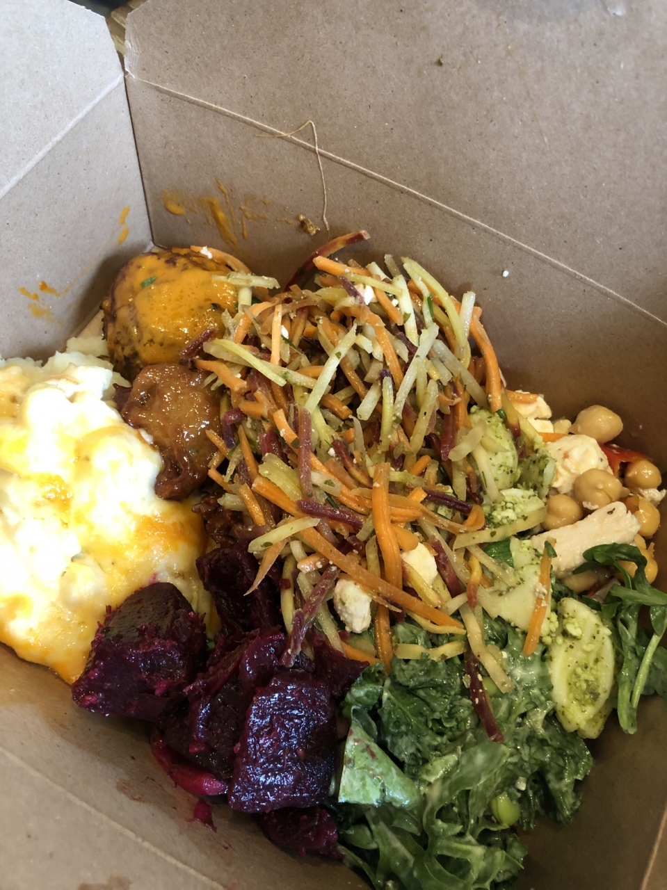 こちらのお店が1番賑わっていたのとビュッフェ式の弁当の種類が1番多く、美味しかったです。店内のショーケースにマドレーヌやクッキーなどありますが、これがまた美味しいのでぜひ食べてください。トングがないので近くに紙ペーパーがあります。これを使って手で袋に入れます。1個1.3ドルです。レジで数を聞かれることもあります。ブライアントパークオリジナル魔法瓶を買っちゃいました。473mlと微妙なサイズ感で使いやすいです。