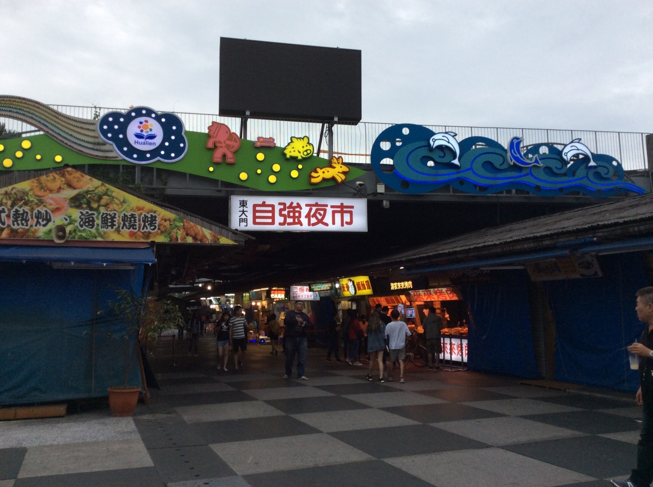 自転車を借りて偵察に行ってきた。花蓮の街の海側の広場にあっちこっち夜市が出て、自転車で回ってみると自強夜市が一番早くお店の用意を始めてて、電飾も結構派手。何も買わなくてもインスタ映えする夜市だった。また一部トンネルのしたでやってたりして、雨対応もできてる。