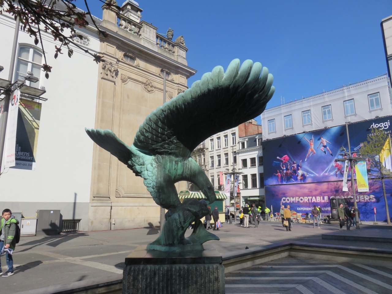 ルーベンスの家に行く途中に広場があり、そこには池には噴水が設置されていて大きな鳥のブロンズ像がその池の中にありました。池の周りには人も集まり、腰を下ろして休んだりして休息する人達も見かけました。羽を広げて魚を掴みそうで、その勇壮さを感じました。
