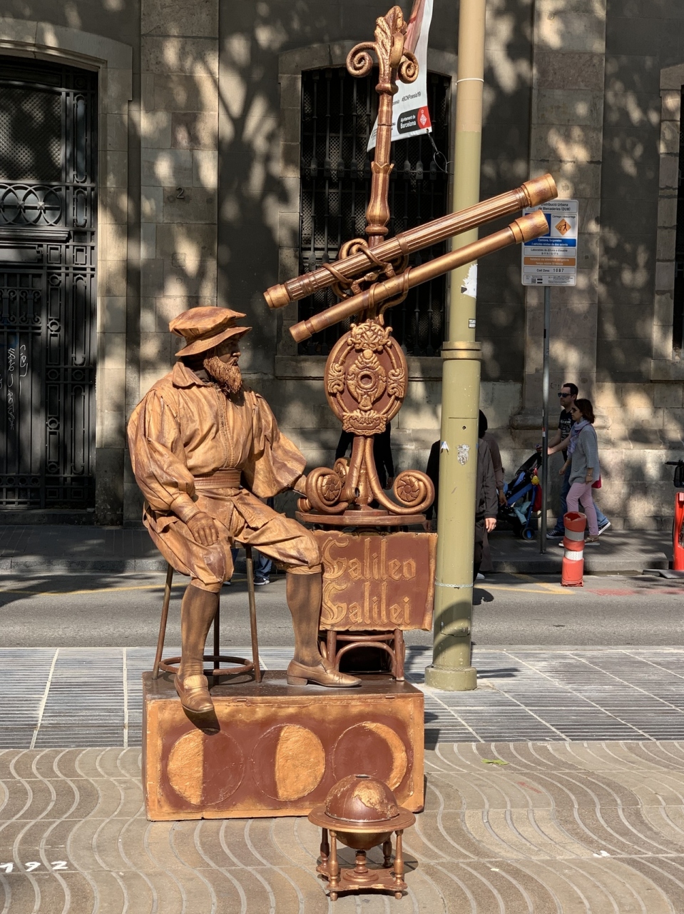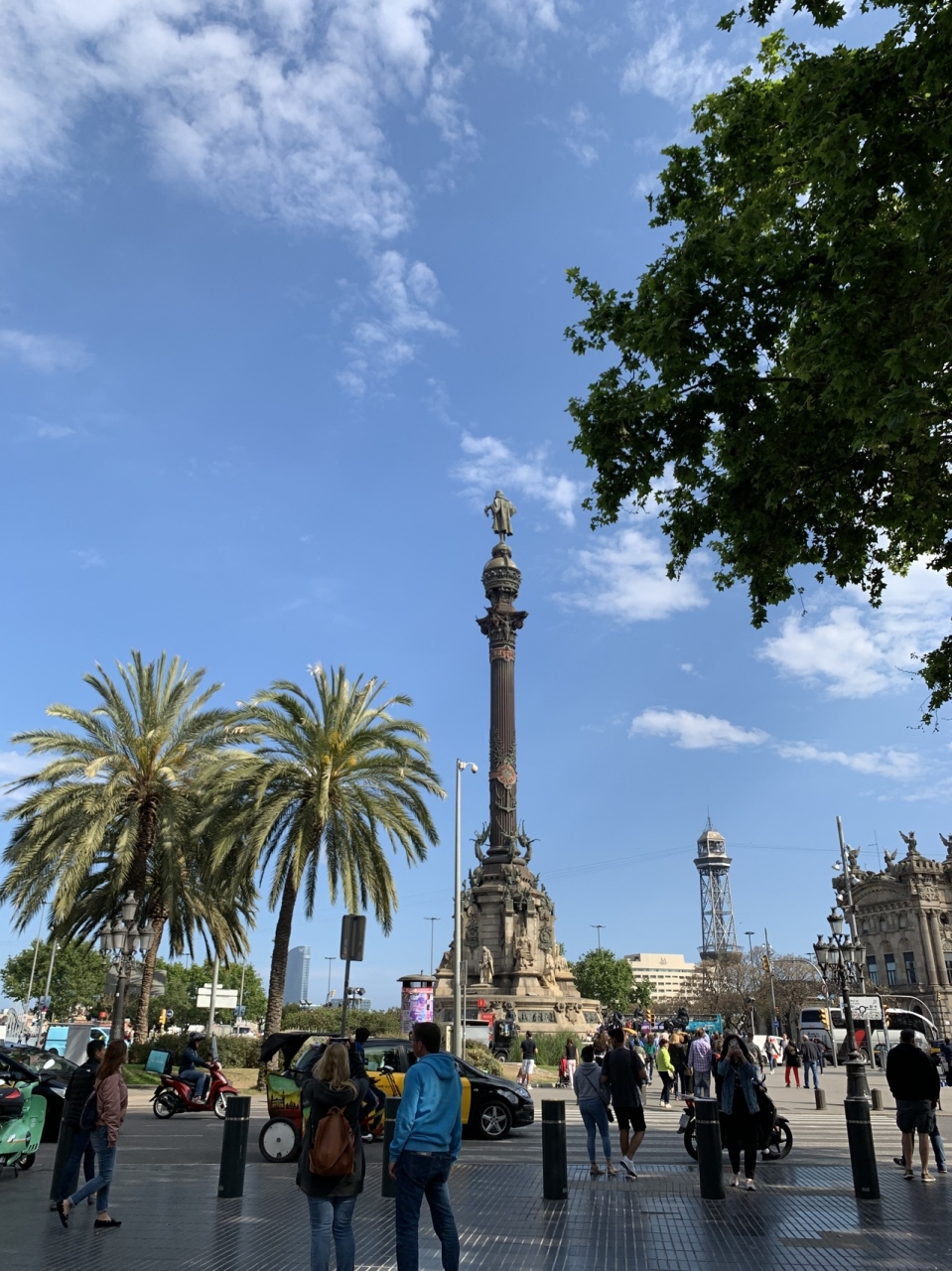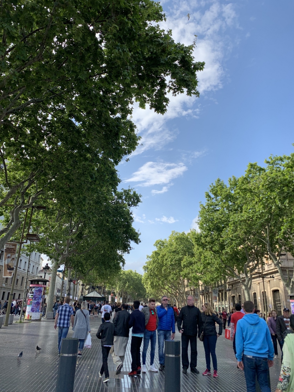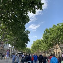 ランブラス通りはカタルーニャ広場から海側にあるコロンブスの塔に向かって真っ直ぐ伸びる約1.2kmの通りです。レストランやカフェ、お土産店が並び大道芸人も多くたくさんの観光客で賑わっていました。この通りにはバルセロナで有名な市場も観光客で賑わっていました。