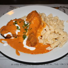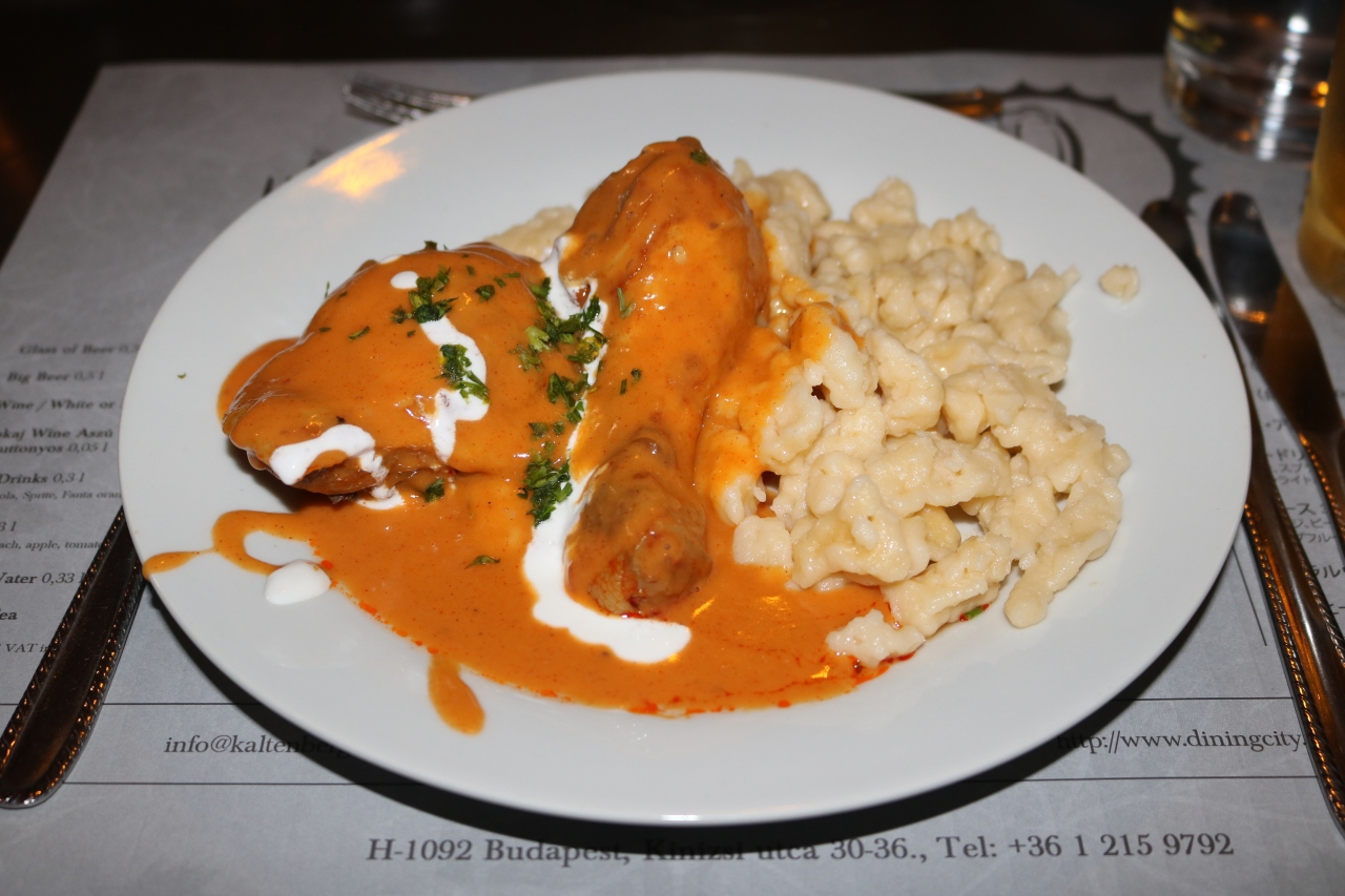 建物の内部は広く、トイレまでが遠いです。でも、お客さんをたくさん入れたいのか、テーブルをたくさん入れすぎていて、一人一人の幅がすごく狭いんです。ハンガリーの代表的な家庭料理のパプリカチキンを食べましたが、料理はおいしかったです。