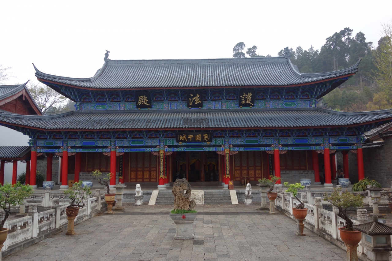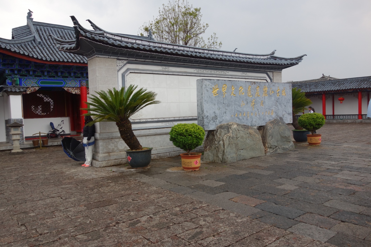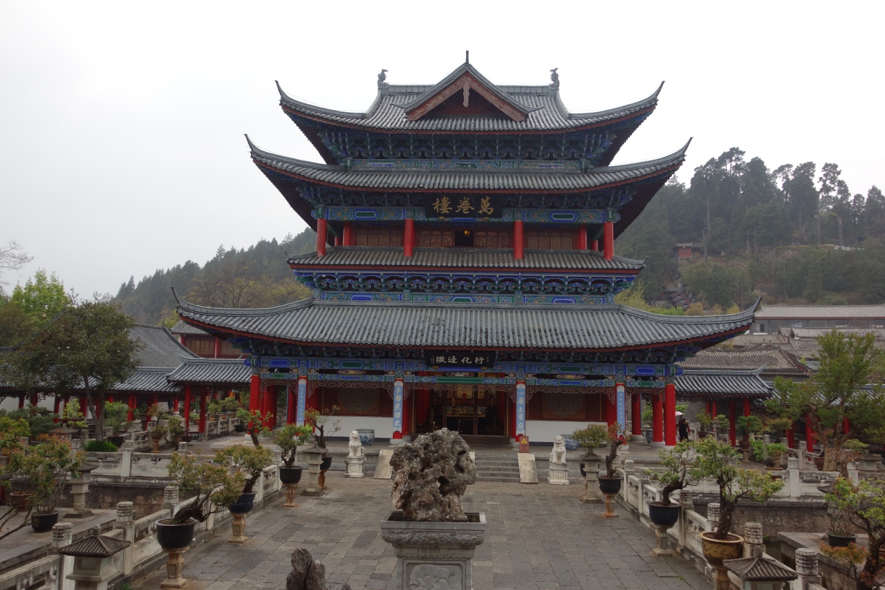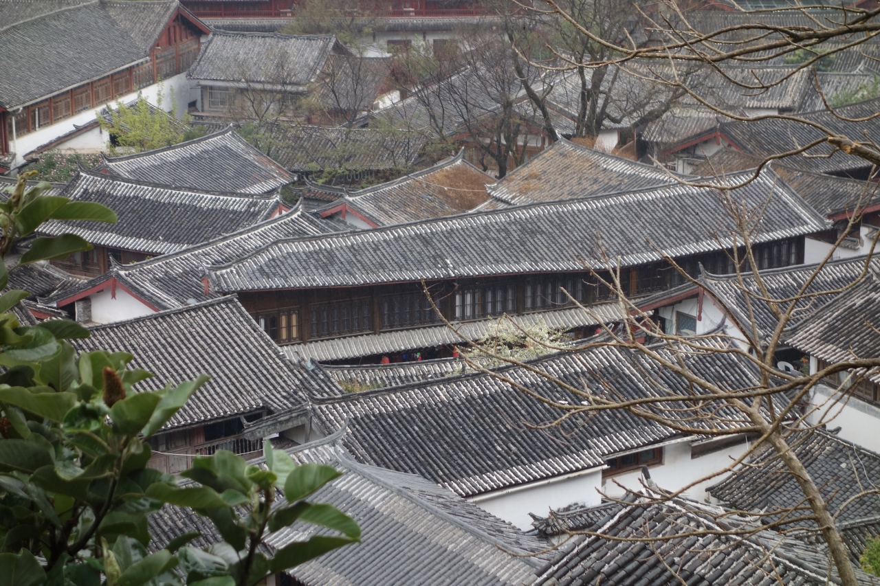 議事室・図書館・裁判所・舞台・・とちょっとずつ造りも用途も違う建物を経て、回廊を登って上から見まわすと、雲南らしい屋根が連なった景色が見渡せます。またその屋根と整然と並ぶ青っぽい屋根に赤い柱の色が映える木府の美しい建物との対比も素敵です。わざわざ入場料を払って来たかいあり!でした。