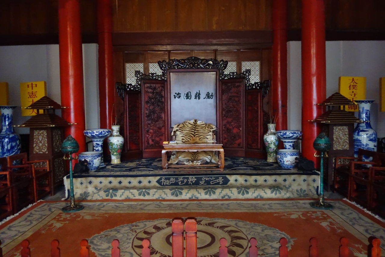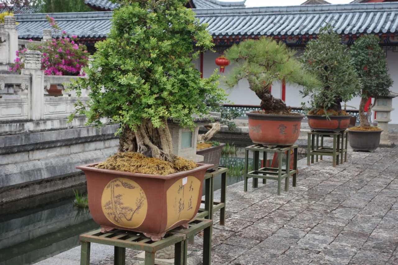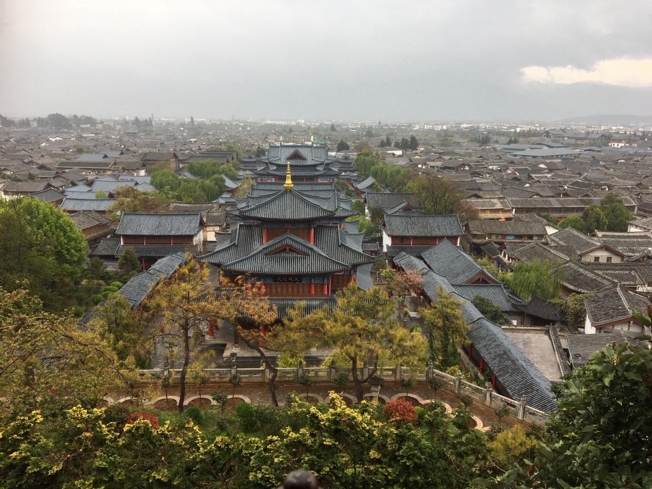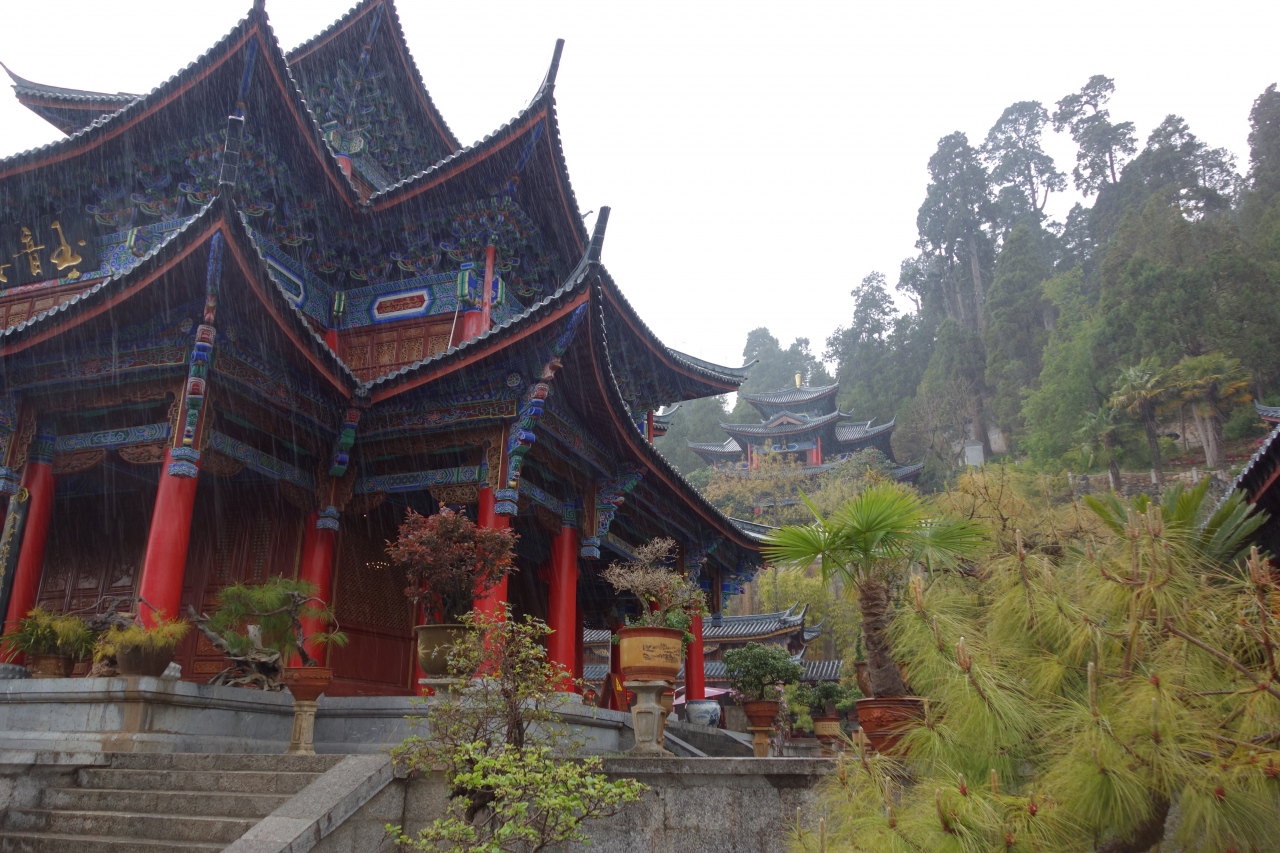 議事室・図書館・裁判所・舞台・・とちょっとずつ造りも用途も違う建物を経て、回廊を登って上から見まわすと、雲南らしい屋根が連なった景色が見渡せます。またその屋根と整然と並ぶ青っぽい屋根に赤い柱の色が映える木府の美しい建物との対比も素敵です。わざわざ入場料を払って来たかいあり!でした。