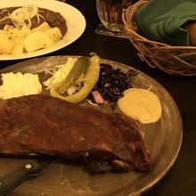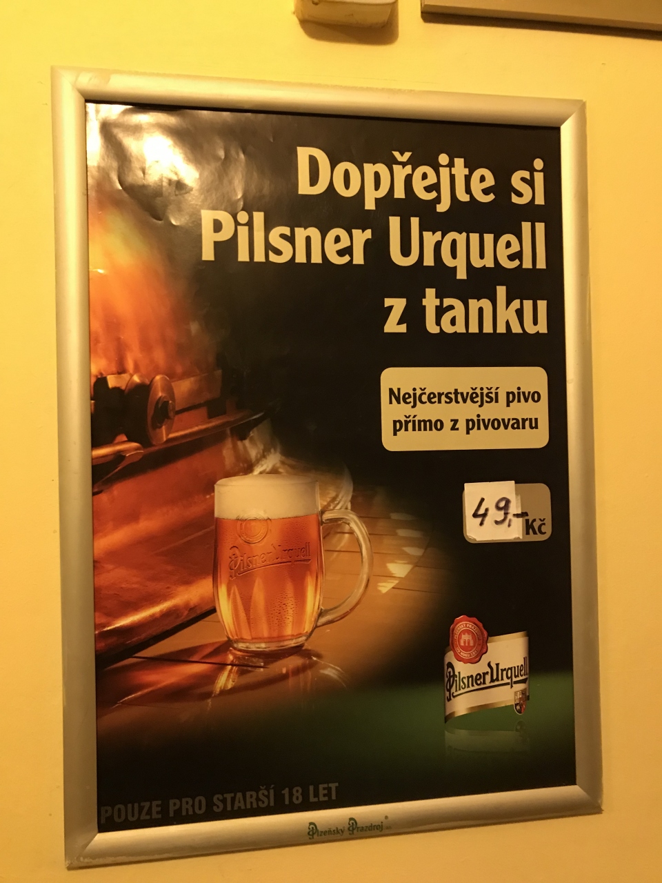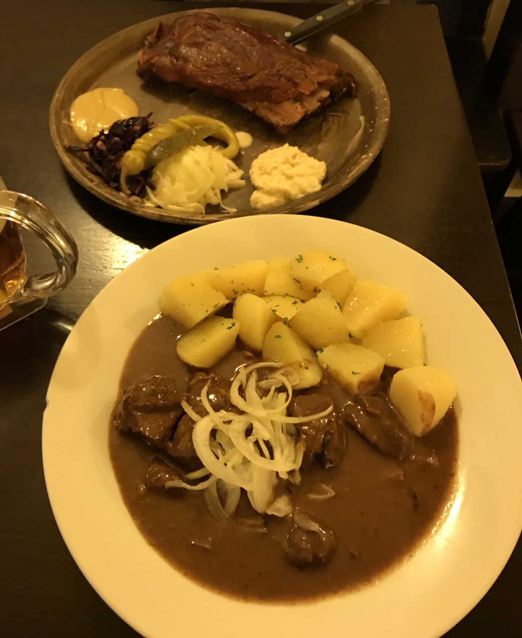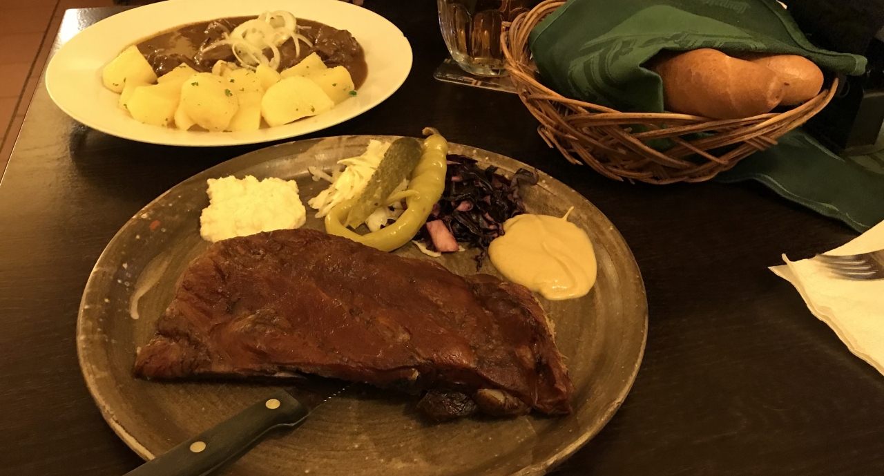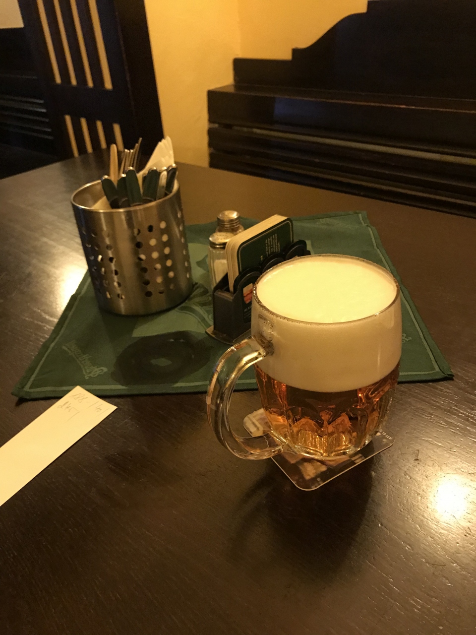 メニューはチェコ語のみでしたが、店員さんは英語も話しますし、メニューを選ぶのも手伝ってくれます。ビールは、ピルスナーウルケルが飲めます。1杯49CZKでした。メイン2種類とビール2杯を注文して、約600CZKと良心的な値段でした。