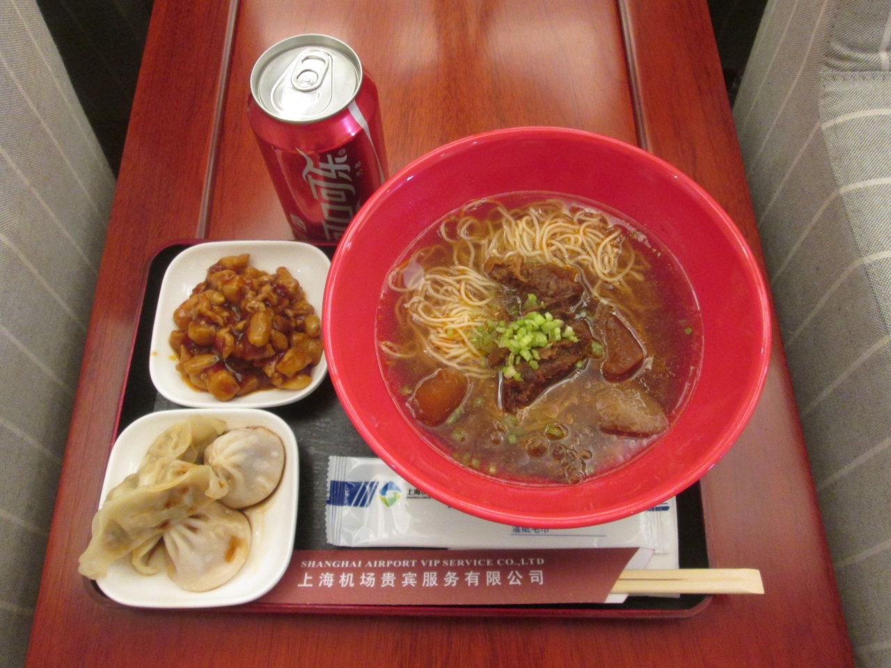上海空港サクララウンジにはヌードルバーがあり利用時の楽しみです。前の古いラウンジはカレーがありましたが、現在はヌードルと点心が看板メニューでした。トッピングの煮込んだ肉はリクエストすると多めに入れてくれて、点心は種類と個数を指定できました。