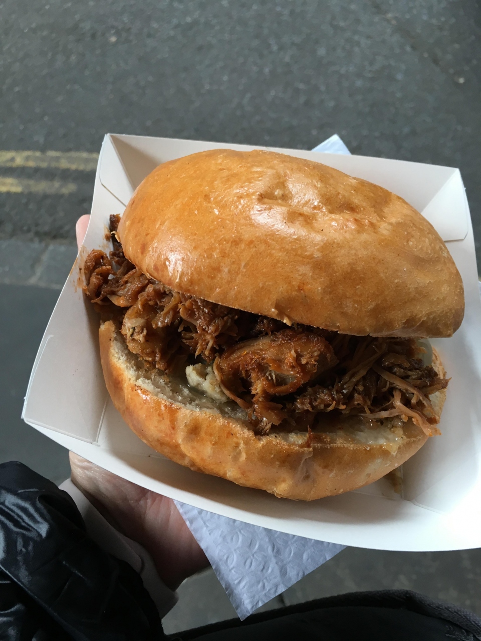 おいしそうなものをいっぱい売っているマーケットだったが、とにかく人(観光客)が多い。その場で食べられるものを売っている店がすべてではなく、チーズとか肉とか野菜・果物を売っている店の数もそれなり。マーケット自体は屋内型(屋根あり)で、その外の一角にストールがいくつか並んでいる(屋台が並んでいるようなイメージ)場所があってそこはすぐに食べられるものばかりを売っていた。ただし、現金払いはなしで、キャッシュレスのみとなっていた。結局、webでみてちょっと気になっていたうちの一つのお店"Hobbs Meat Roast"で"Traditional Roll"(5GBP)を購入。"Roll"というが、パンはハンバーガーに使うようなバンズ(ただし直径は15cmくらいありそうな大きさ)だった。そこにローストポークがたっぷり、リンゴベースのソースがたっぷり、野菜も入っていて、これはどうやって食べたらいいんだろう?という大きさだったけれどおいしかった。