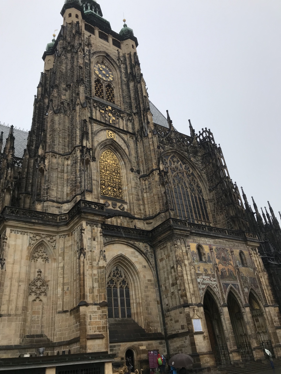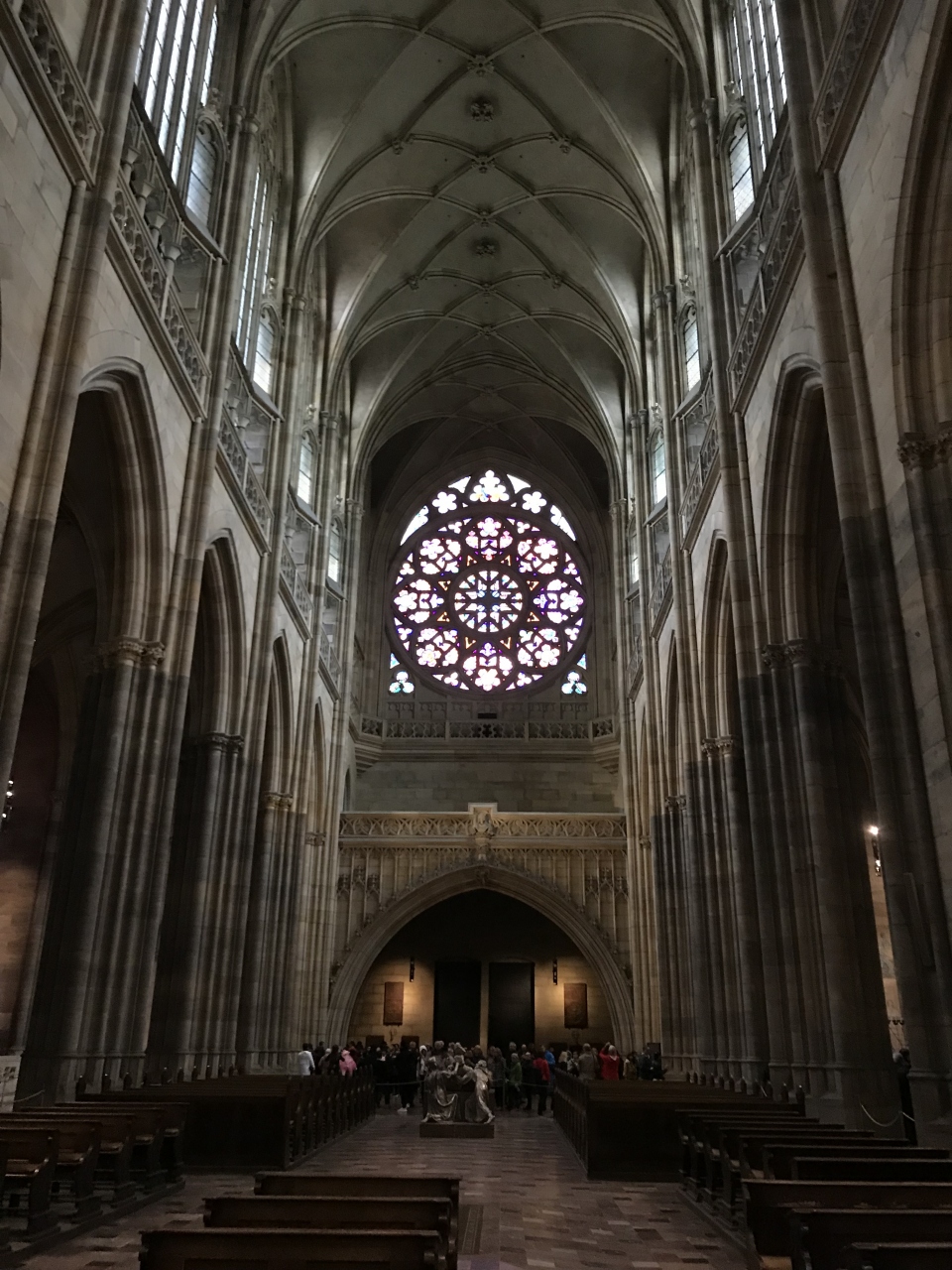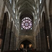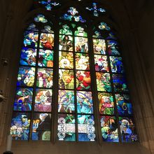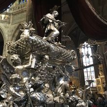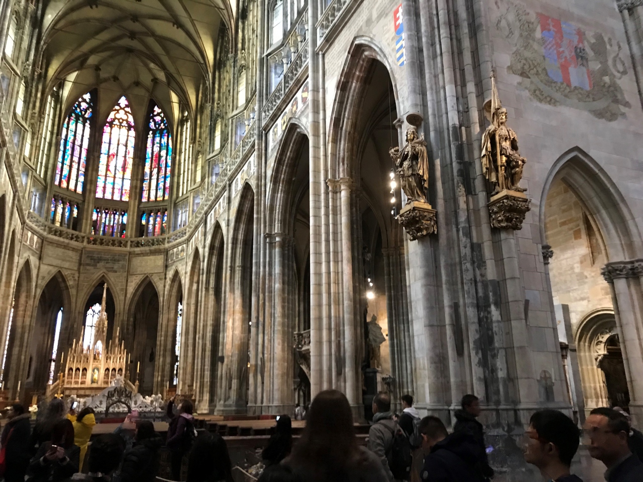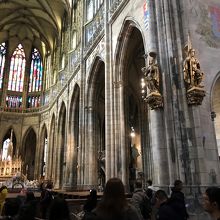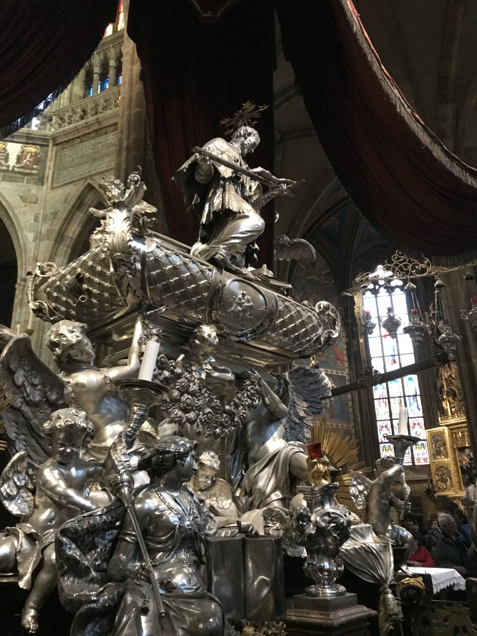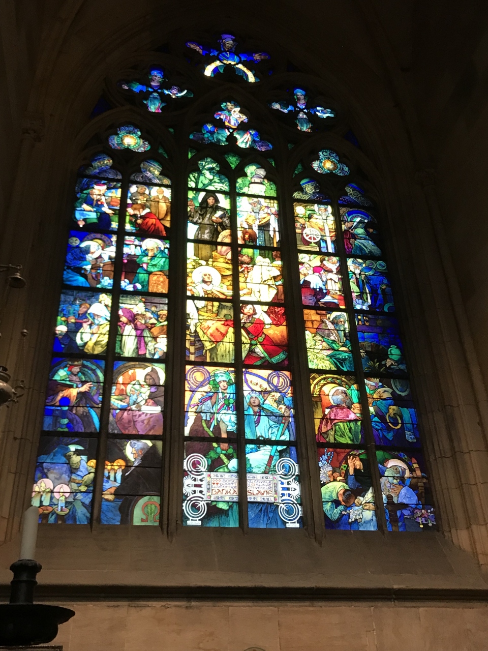 見所の一つであるミュシャのステンドグラスは、入場してすぐの所にあります。ステンドグラスが複数並んでいますが、ミュシャに詳しくなくても、画風でそれとわかるものでした。その他、カレル橋にある聖人像でお馴染みの聖ネポムツキーの墓もここにあります。