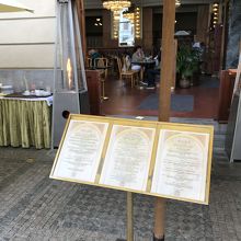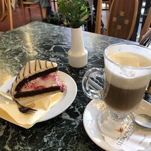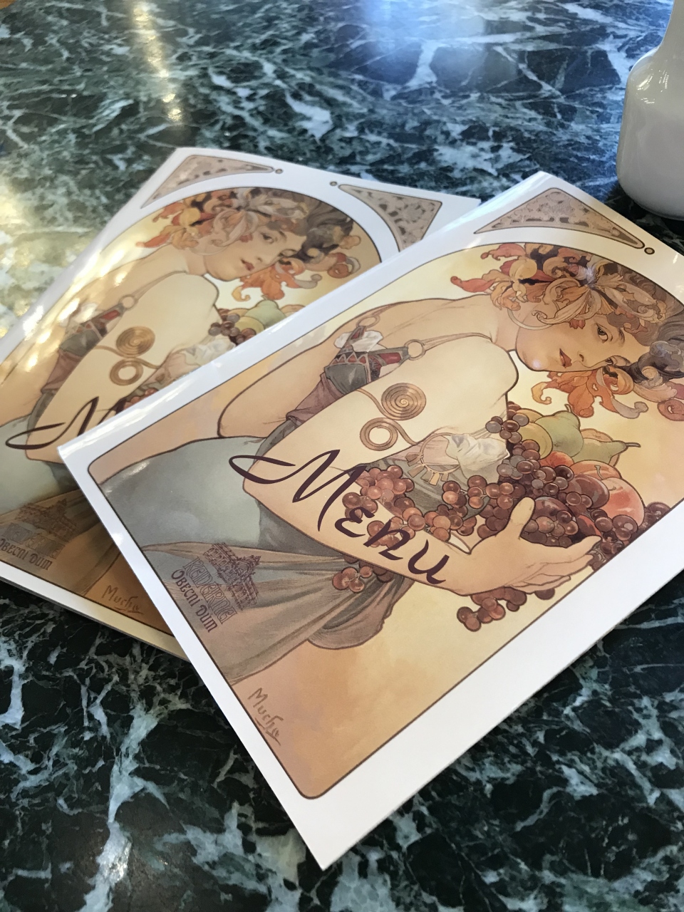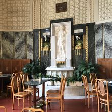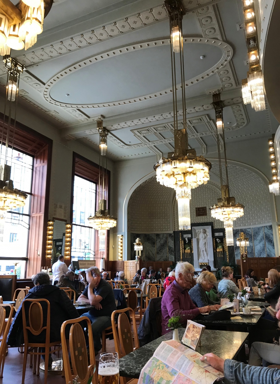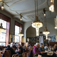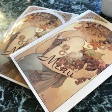 市民会館にあるカフェです。テラス席もある大きなカフェでした。メニューには、ミュシャの絵が描かれています。値段は、ユーロ併記でした。ケーキは全て120 CZK、ワゴンで運んできてくれるので、好きなものを選びます。天井が高い店内には、噴水もあるなど、雰囲気も良く、お勧めのカフェです。