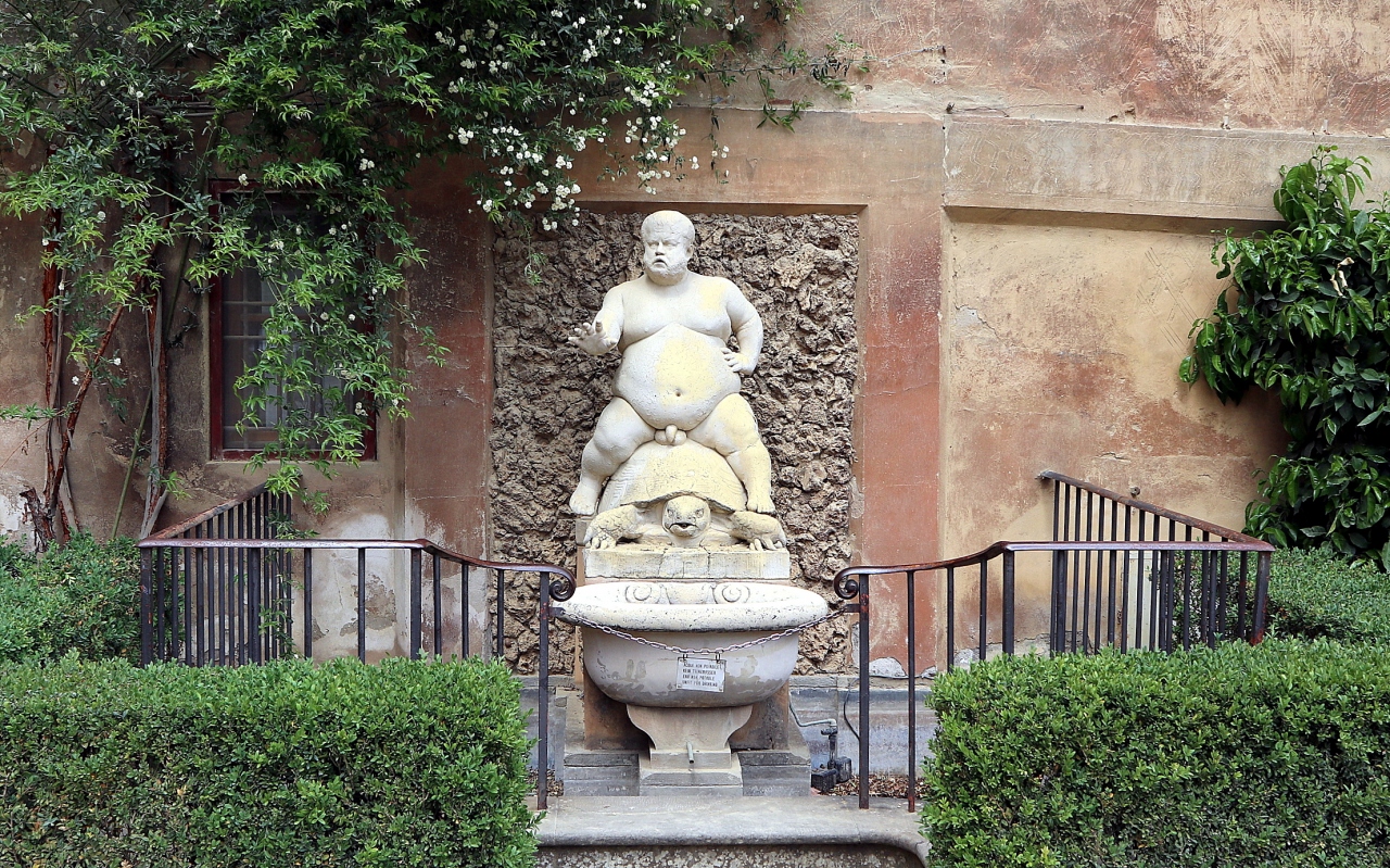 庭園内は結構高低差がありますが,5月初旬のこの時期は暑くもなく,緑の中を上り下りして歩いて回るのも気持ちがよかったです。今回は,「インフェルノ」の舞台となったスポットを巡るのが目的で,ストーリーとは逆ルートですが,まずは「バッカス像」と「ブオンタレンティの洞窟」の方へ下りました。鳥のさえづりが心地よく聞こえてきます。ヴァザーリ回廊の出口の灰色の扉も現認。「円形劇場」には,新しいオブジェを飾るため,クレーンが置かれていて残念。「フォークの噴水」ことネプチューンの噴水までは結構な登り。そこから,ラングドン教授らの逃走路ラ・チェルキアータ(糸杉の大通りの両側に設けられていますが,映画に使ったのは南側だと思います)へ。これが400mくらい続く結構な斜度の坂なのです。インフェルノのルートを逆行しているので下りでしたが,ラングドン教授(トム・ハンクス)は長い登り坂を駆け上がって,さぞ息が切れたことでしょう。