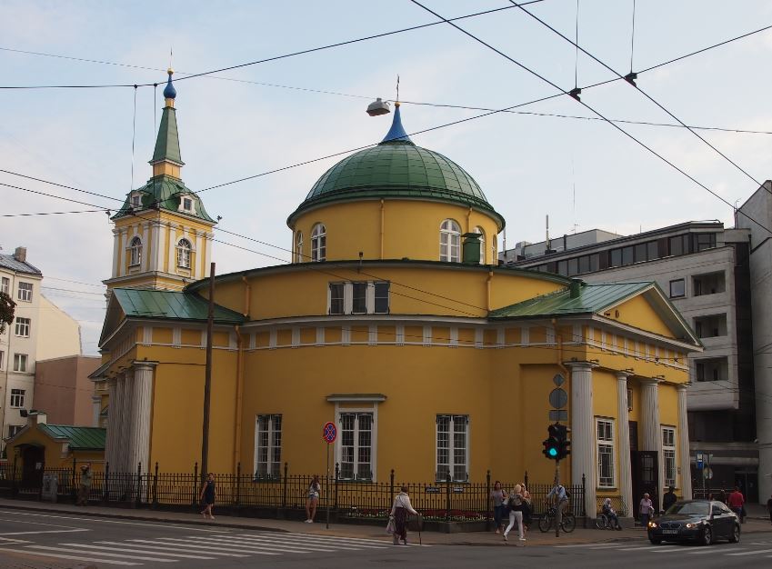 旧市街からリガの新市街に続く幹線道路 Brivibas通りにある黄卵色のずんぐりとした教会がアレクサンドルネフスキー教会(St. Alexander Nevsky Church)です。帝政ロシアの英雄の名を冠した教会ですね。今もしっかり利用されています。