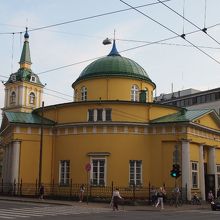 新市街にある黄卵色のずんぐりとした教会