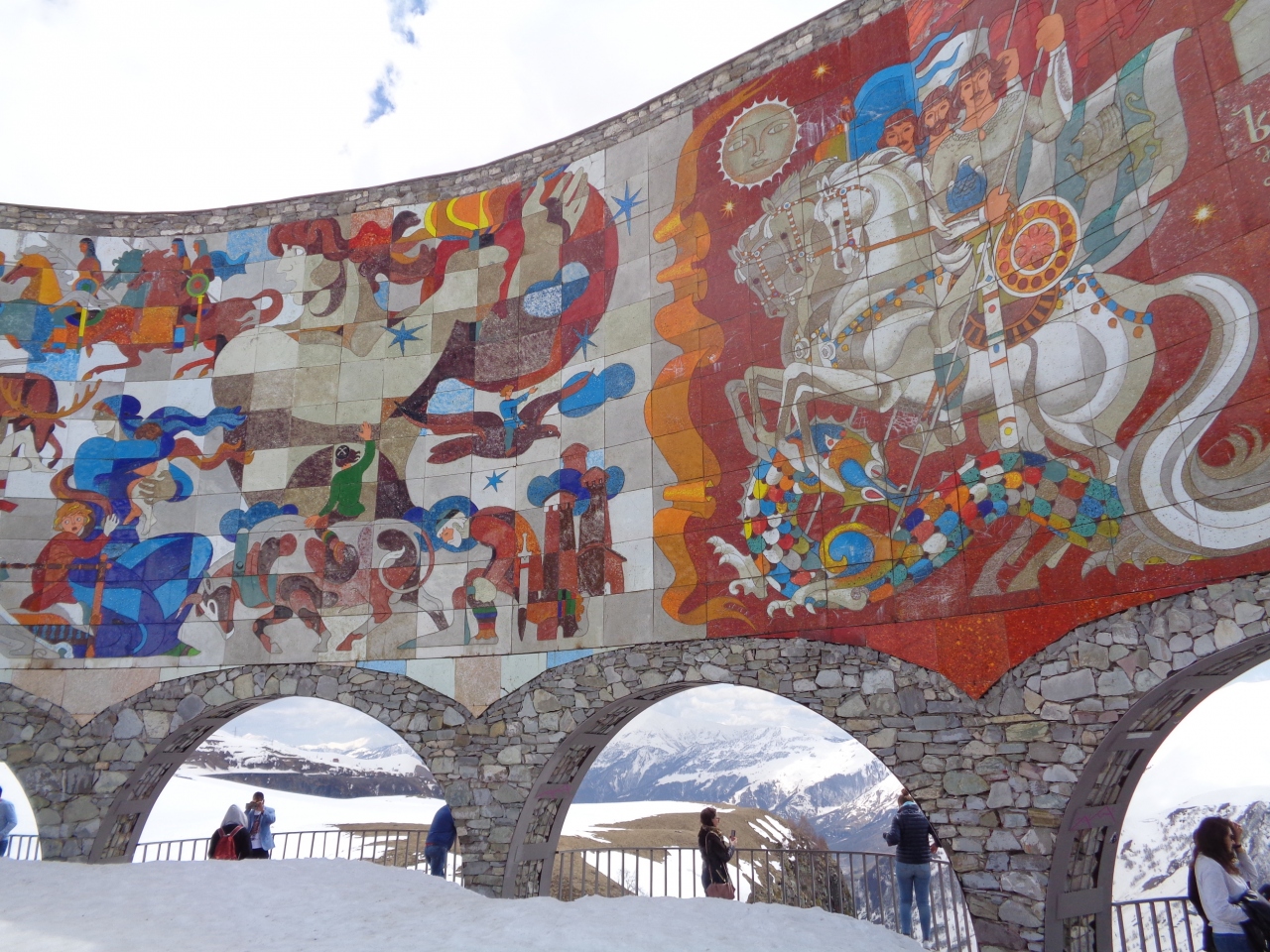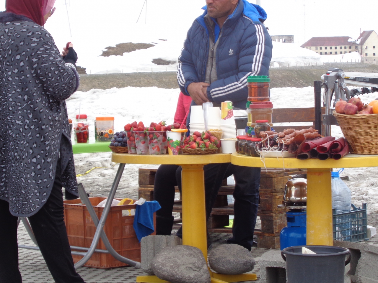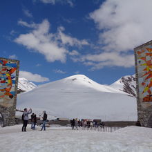 雪景色と派手な色合いのモニュメントがマッチして素晴らしい眺めでした。駐車場にはチュルチヘラやイチゴを売るお店が出ていて、ここで初めてチュルチヘラを食べました。予想以上に美味しくて、すぐに1本食べてしまいました。