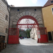 チェスキ―クルムロフ城から旧市街地側へ坂道を降りたところにある赤い門。大きく立派な門ではありますが、特徴があるわけではありません。