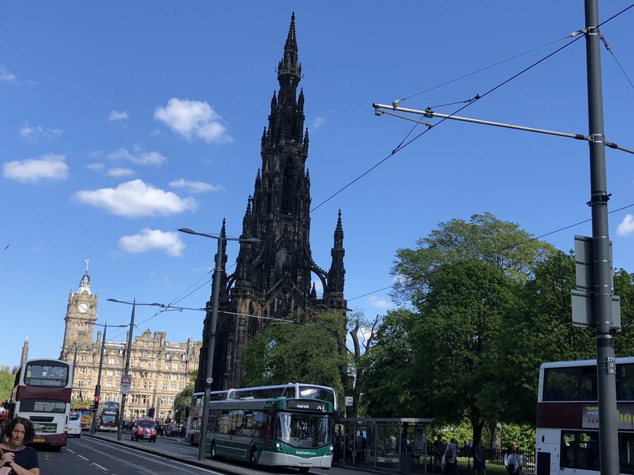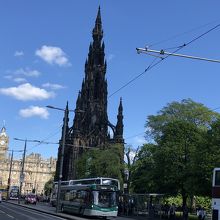 道路沿いに「スコット記念塔」少し遠くを見ると「エジンバラ城」を見ることができます。
