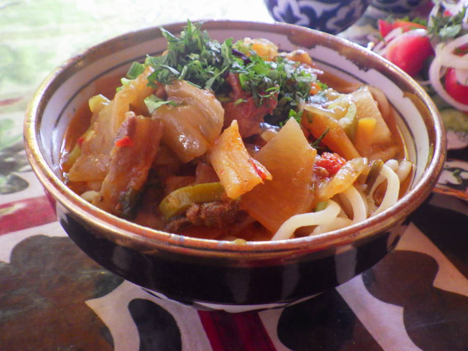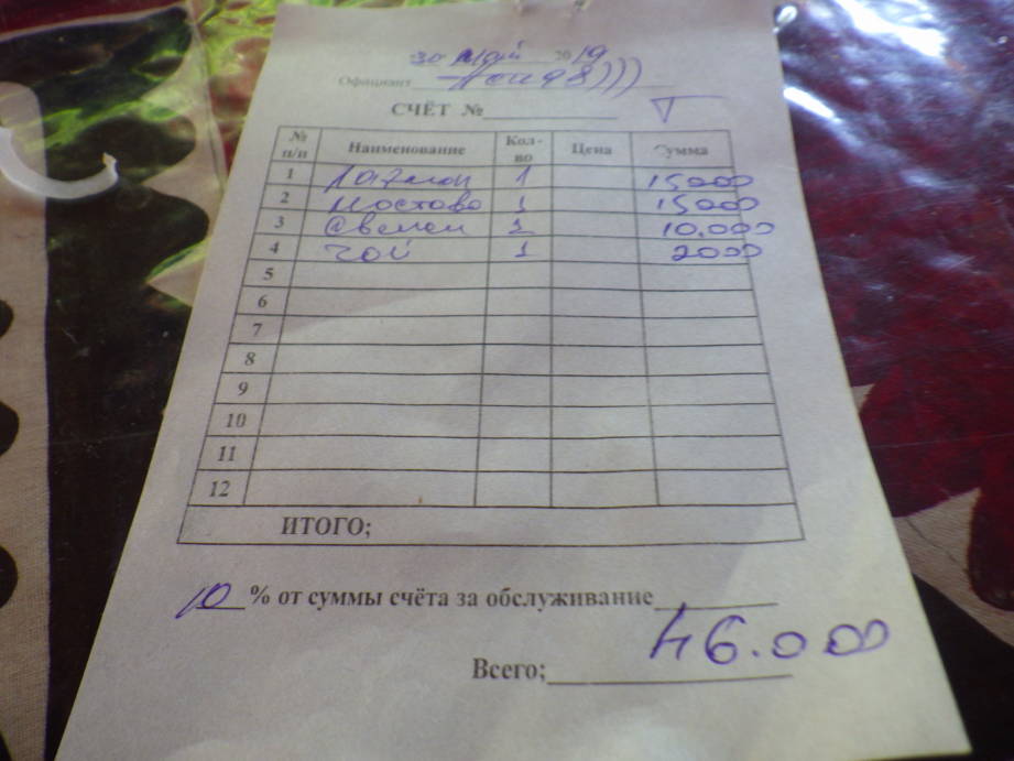 ビビニニムモスク近くにあるレストランです。写真付きメニューが結構雑でスープと麺を頼んだら同じスープの麺入りと麺無しが出てきました。どちらもいっぱい15000スムでした。塩が効きすぎていてしょっぱくて体に悪そうでした。トマトサラダとお茶をつけて二人で46000スムでした。これだけ出すなら、カリムブックなどの有名店でもっと洗練されたものを食べられたと思います。