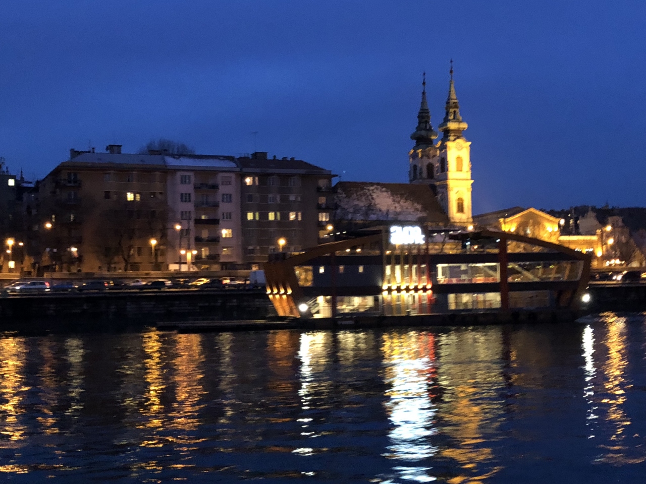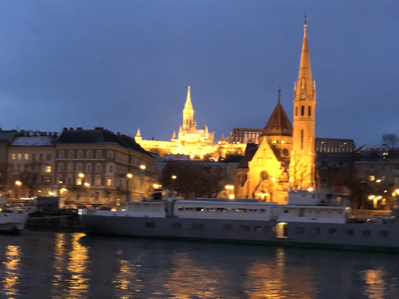 夜景クルーズに参加しました。2月だったので日が暮れるのが早いので17:00過ぎには船に乗り込みます。場所は船によっても違うようですがライトアップされたで建物が美しく見える場所の関係で国会議事堂周辺から始まります。王宮や漁夫の砦 大聖堂や鎖橋などを見ながら国立コンサートホールを見てUターンの一時間半位のコースです。