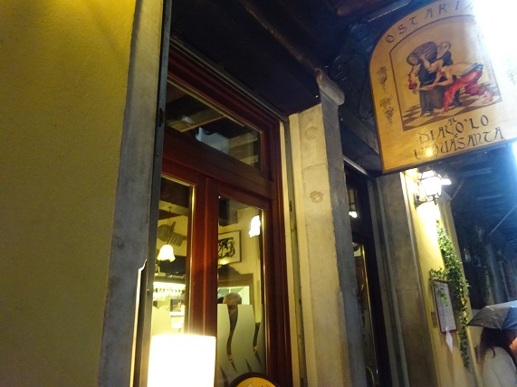 日曜日の昼に行きました。ネットやガイドブックの地図をプリントして持っていき、リアルト橋を渡ってしばらく歩いてこのあたりかもと左側の路地を見ると看板を見つけました。