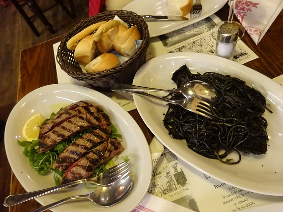 イカ墨のパスタと牛肉のグリルとお店おすすめの白ワインを頼んで二人でシェアしました。パスタはイカの旨味が効いて程よい味、一方牛肉はレモンをかけるだけで十分、さっぱり味でどちらも満足のいくものでした。おじさんの店員が片言の日本語を話すなどとっても陽気な人でした。観光客もいますが、店員と雑談するぐらいなじみの地元の人もいました。13時ごろ、店を出るころには満席になっていました。