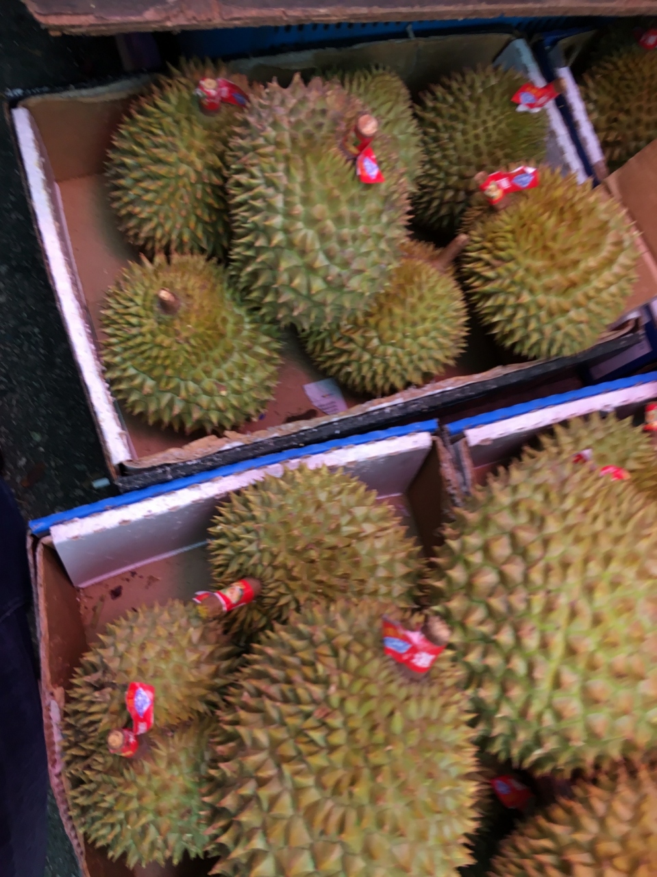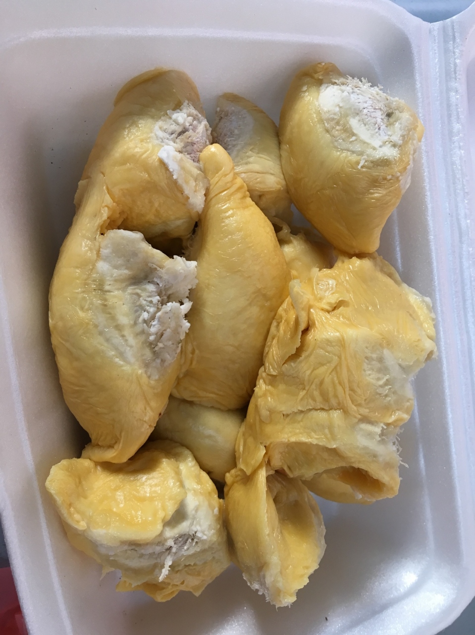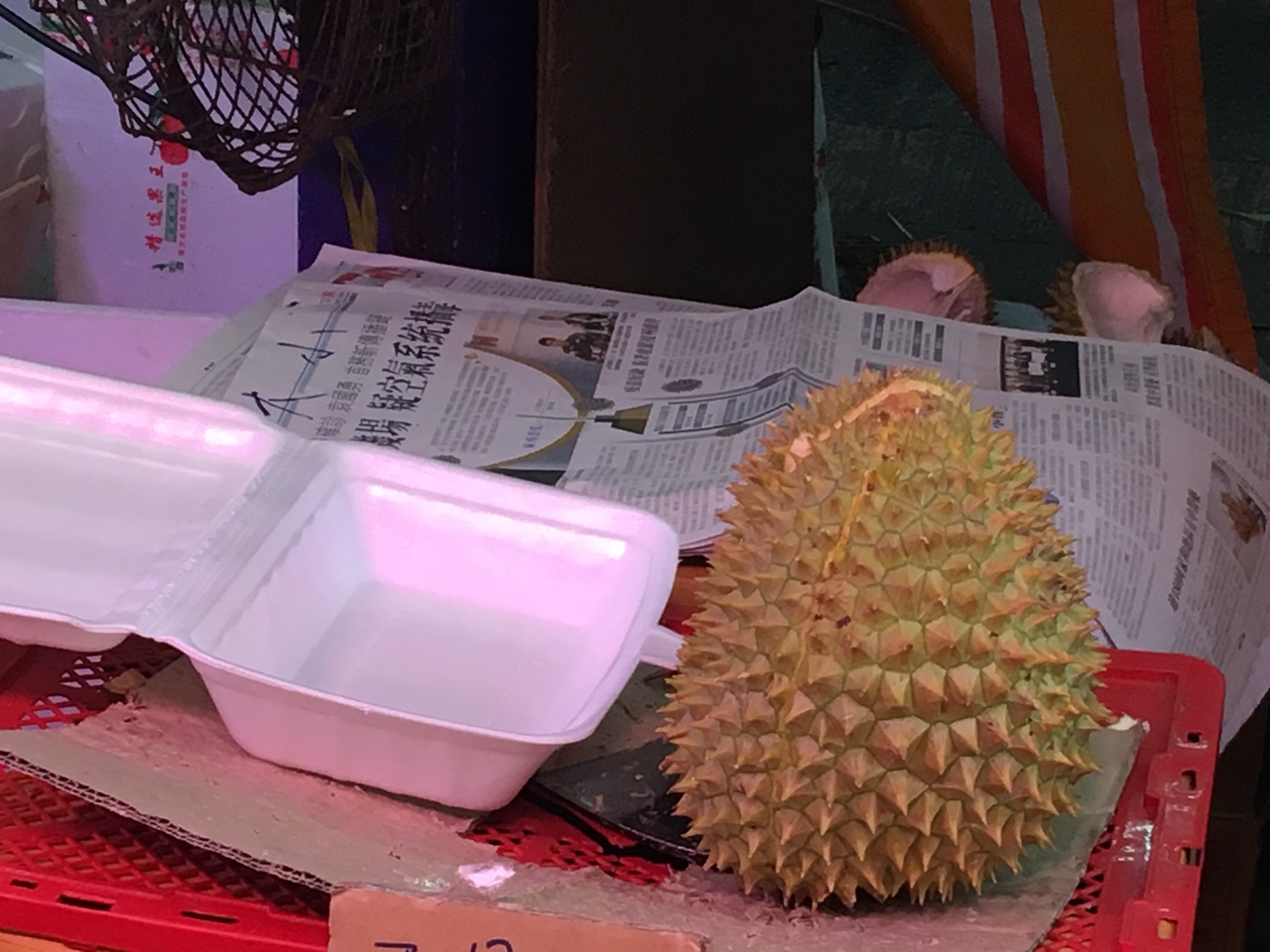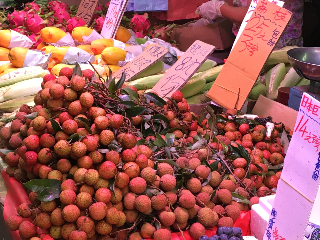旺角駅付近のネイザンロードに並行する通りで両脇フルーツを売る店が並びフルーツを買い求める人で賑わっていました。5月中旬はライチの赤色やマンゴーの黄色、甘く濃厚な香りのドリアンが並んでいました。ドリアンは一個買いしなくてはなりません、購入最低量が大きいのが観光客にはややネックです。