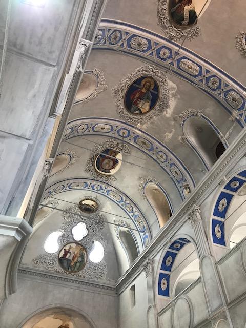 トルコのイズミール から車で1時間ほどのリゾート地チェシメのチェシメ城城塞へ行くついでに立ち寄った教会です。バスターミナルから歩いて行くと、チェシメ城城塞よりも奥にありますが、歩いて5分ほどです。教会の中に入ってみると、今は教会として使われている形跡ががなく、バザールの会場になっていました。しかし天井に描かれた絵などはなかなか素晴らしいものでした。