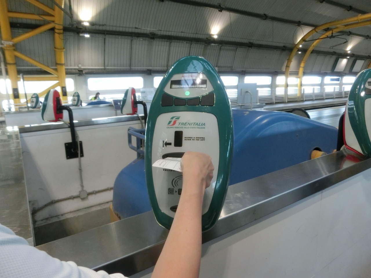 ローマ、フィウミチーノ空港から鉄道のマークを頼りに進めば、問題なく駅にたどり着けます。きっぷの自販機は、クレジットカードも使えます。(が、我々のカードはなぜか処理してもらえませんでした) 窓口での購入も問題なく対応してもらえました。(窓口では、クレジットカード処理してもらえました)