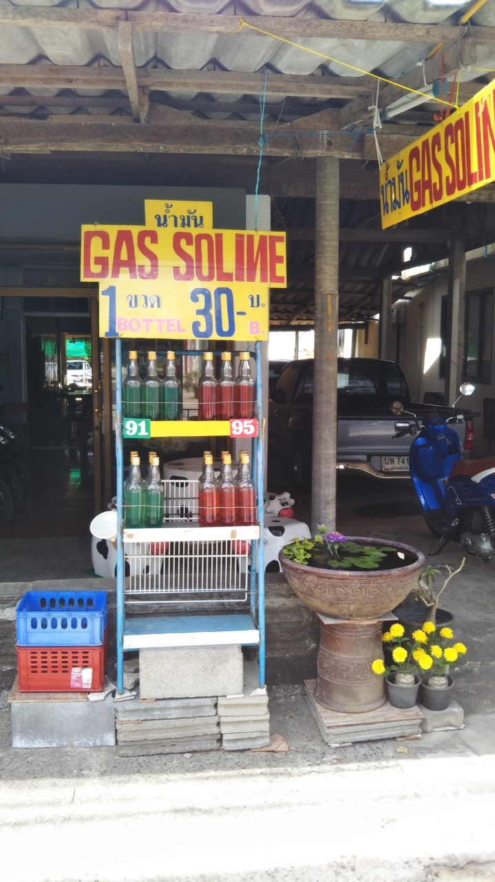 ガソリンは島のあちこちで売っている。1リットル40B(日本よりやや高い?)が相場みたいだが、30Bの店もあった。