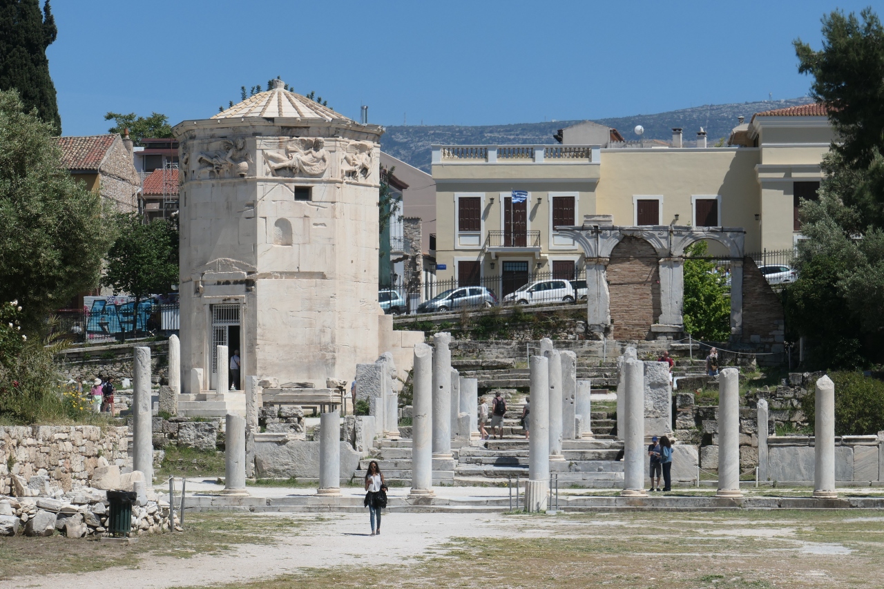 ローマンアゴラにある保存状態が最も良い古代建造物が「風の神の家(Tower of the Wind)」です。一番奥まった場所にある八角形状の大理石建造物で、建物上部に8人の風の神の像が彫られています。高さが13.85mで、古い石版で造られた屋根も残されています。内部は空洞で、床に彫り物や孔が形成された大理石板があり、この場所は見るだけで立ち入りが禁止されていました。多分、貴重な大理石床だろうと思います。