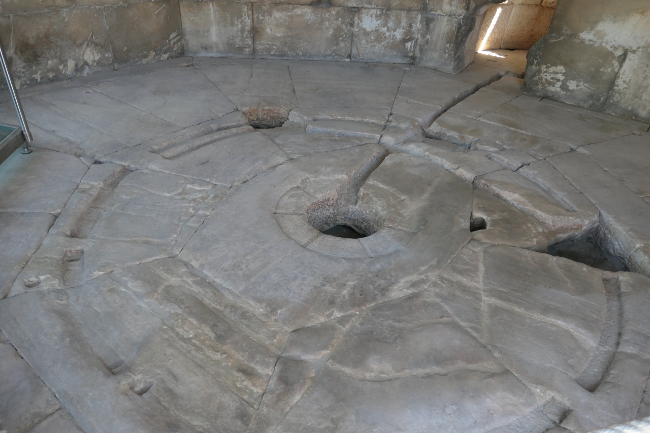 紀元前2世紀頃に建てられたもので、日時計、水時計、風向計が設置されていたそうです。この建物の日本語付加名称の(公衆浴場跡)の起源は不明です。現地にあった説明版にも「浴場」のことは書かれていませんでした。???