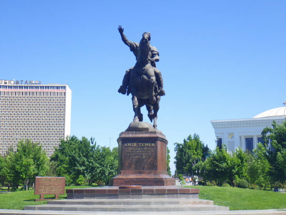 地下鉄をアミール・ティムール・ヒヨポニで降りてティムール広場に向かいました。途中、セキュリティのチェックがありましたが、日本語でにこやかに挨拶してくれました。ウズベキスタンホテルと国際会議場をバックに馬に乗るティムールの像が壮大でした。