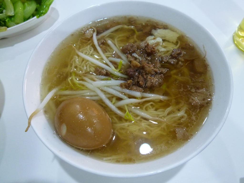 私は汁付き陽春麺煮卵付き、妻は汁付き陽春麺、青菜炒めを注文しましたが、