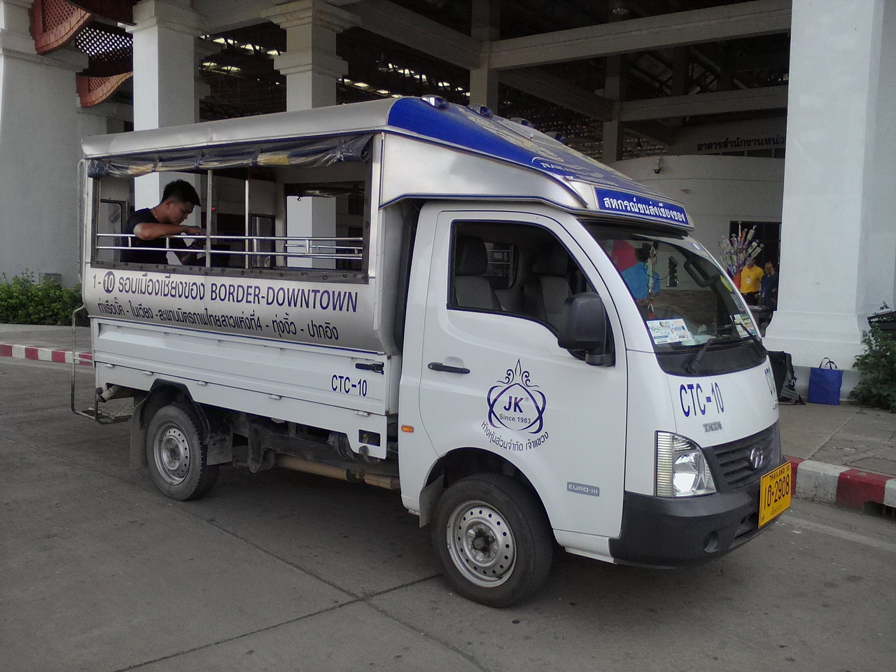 チェンコンの町から第4友好橋であるラオス国境(タイ側のイミグレ)へはソンテウの利用が安いです(1人60B)。車体の横に「BORDERーDOWNTOWN」の表示があります。イミグレから来る場合はちゃんとチケットカウンターもあり、ソンテウが待機しているので乗りやすいですが、チェンコンの町には決まった乗り場がありません。見かけたら合図をして停まってもらうしかありません。これでは使いにくい。