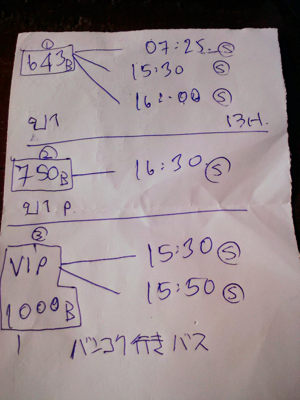 バスのグレードにより料金が異なります。643B、750B、1000B(VIP)の3種。すべてスリーピングです。出発時間は写真参照。