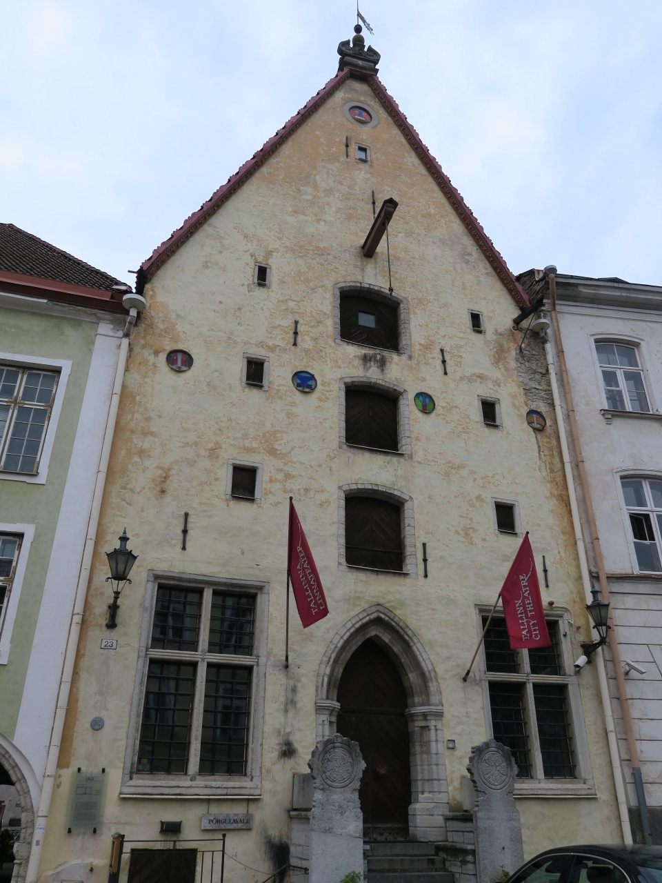「タリン市立劇場」は、旧市街を南北に貫くライ通り沿いにあります。創設は1965年とのことですが、建物自体は16世紀のもので、外観からも中世の伝統的な建築物であることが分かります。角度の急な三角屋根、荷物の揚げ降ろしに用いるバーなどが印象に残りました。