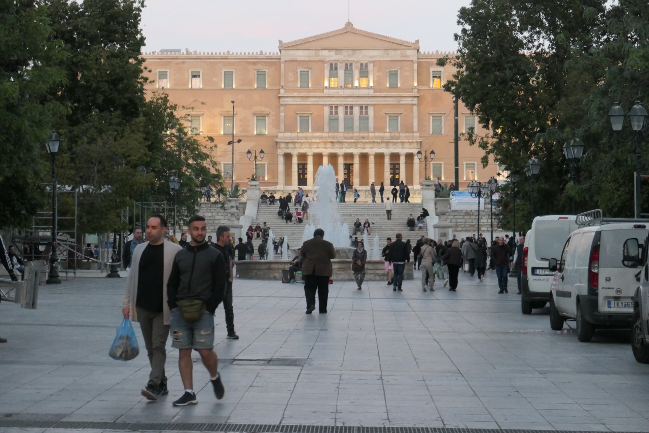 シンタグマ広場は周囲が広い道路で囲まれています。道路向かいには国会議事堂やアテネ国立庭園などもあるアテネ中心部の広場です。アテネ国際空港と市内を結ぶ空港バスや地下鉄の駅があり、市内を循環するバスやトロリーの停留所もありますので、観光客や地元の人も含めて多くの人が広場を行き来しています。我々がアテネ滞在中に宿泊したアテネマリオット(町の南5kmほどの場所)のシャトルバスもホテルからこの広場まで運行されていましたので、複数回この広場を訪れました。