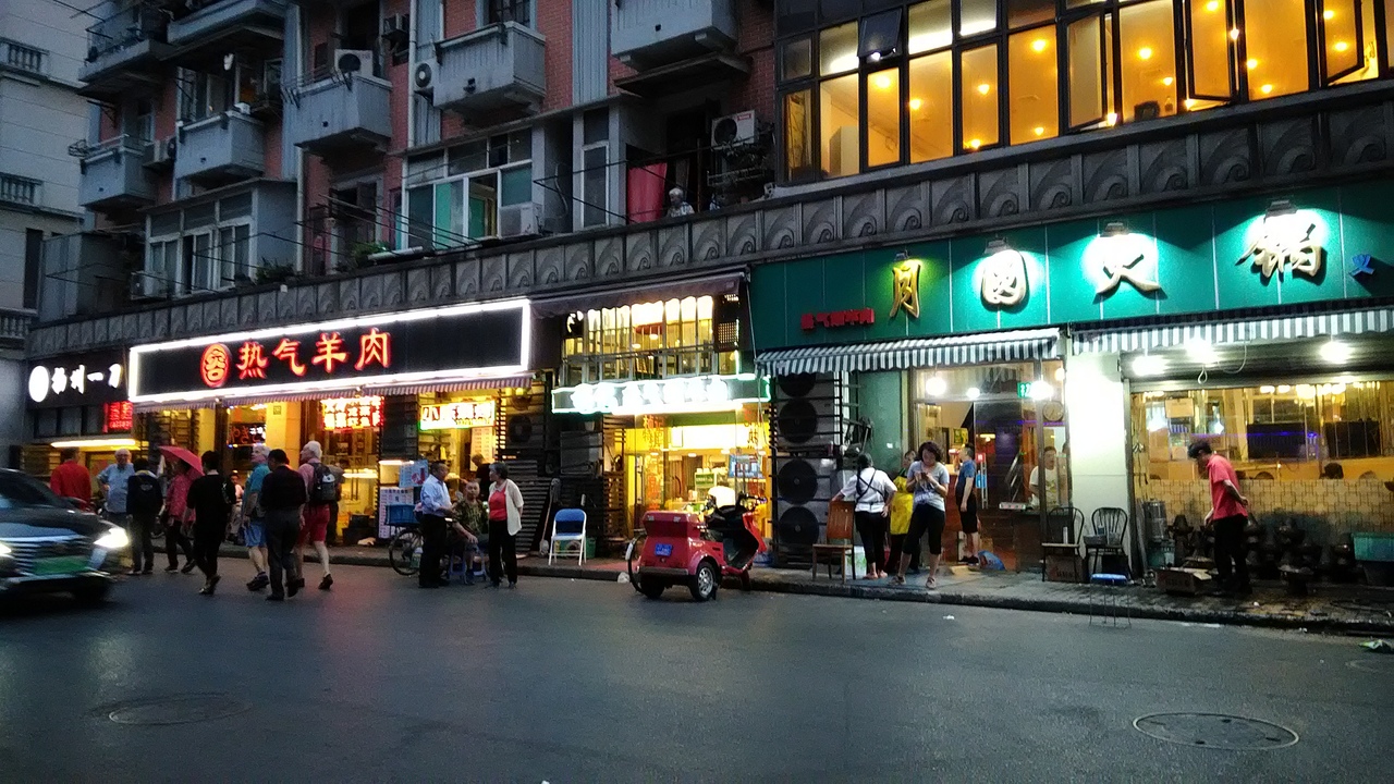 目立つのは火鍋店。店前の海鮮を選んで調理してもらう店や、焼き小龍包の大壺春など食べ物屋が並んでいます。