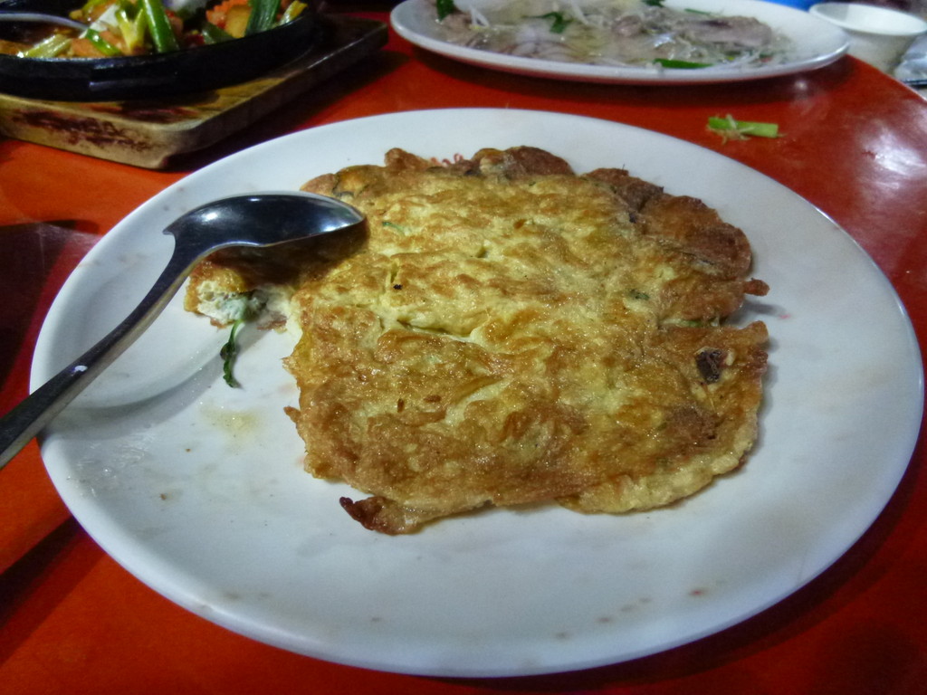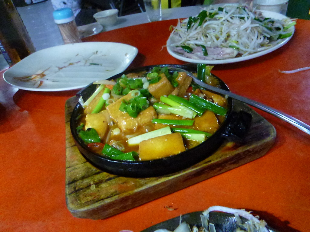 厚揚げ料理、葱と肉の炒め料理、卵料理を食べながら、焼酎を飲みながら、