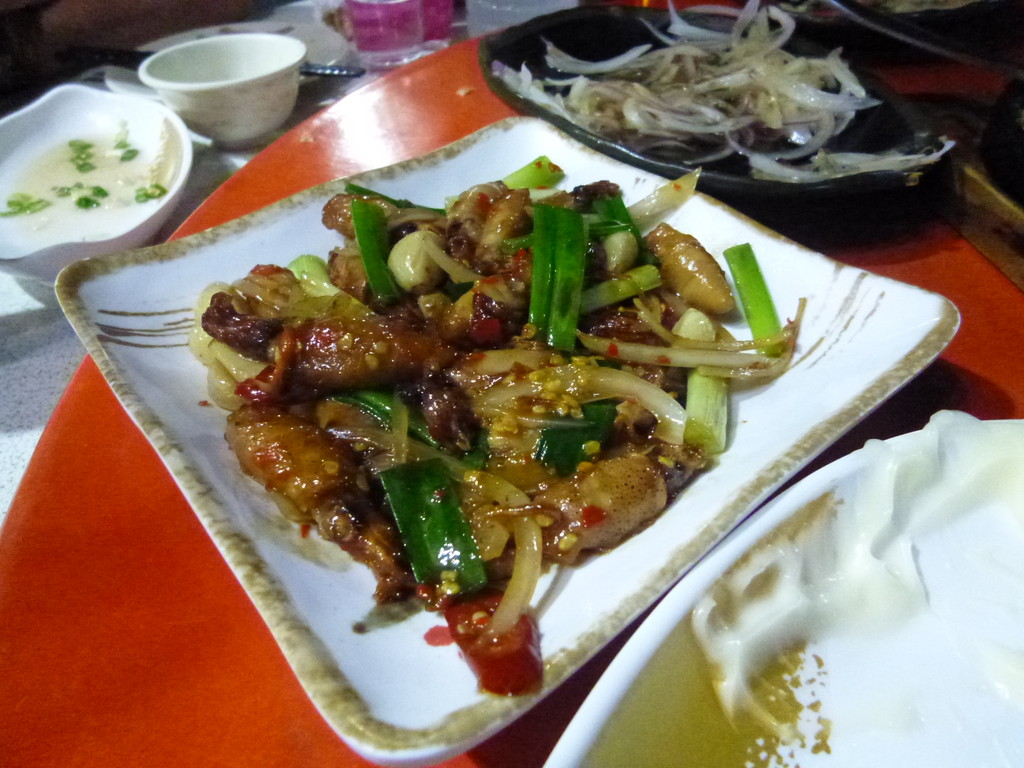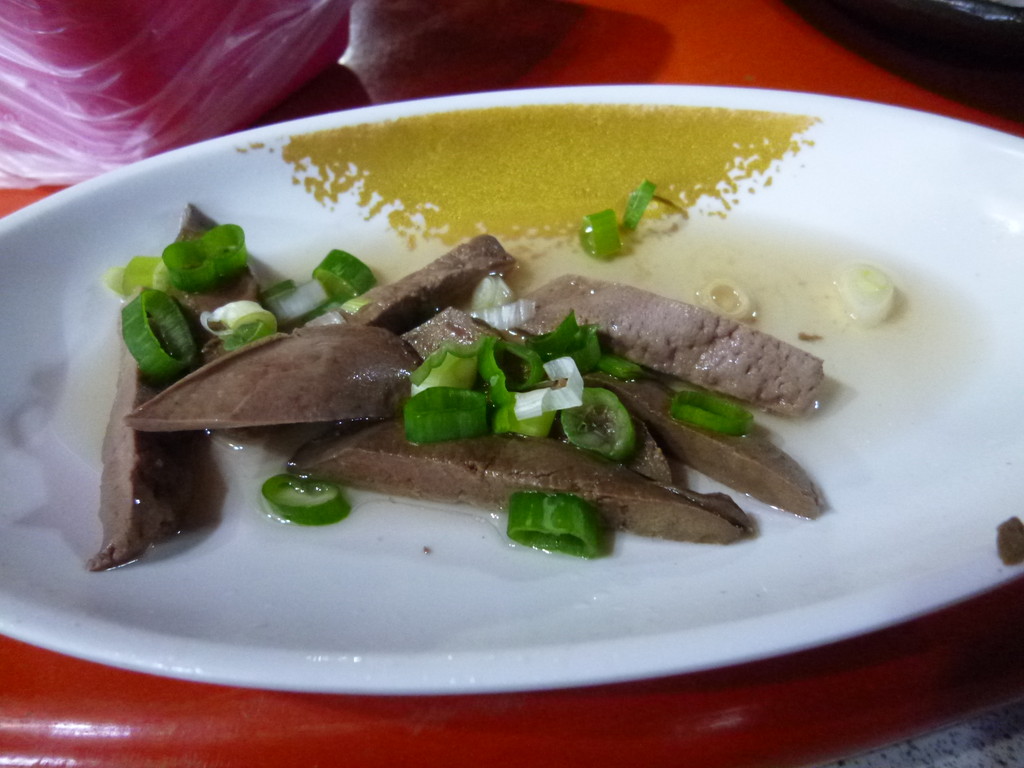 焼酎で乾杯しました。注文した鵝肉モヤシ炒め、タケノコ、玉葱サラダ、レバー、