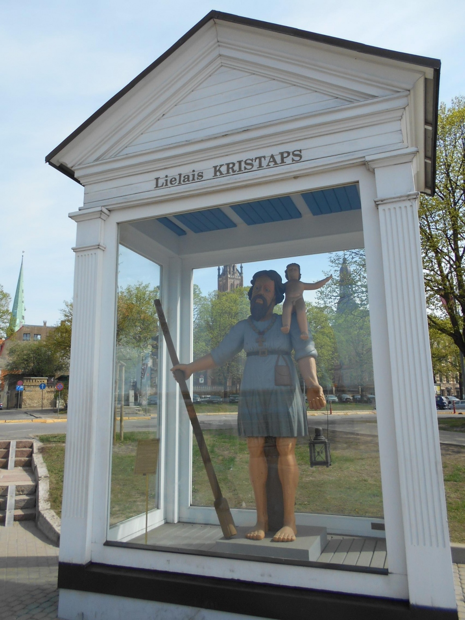 リーガの旧市街の西側を流れている「ダウガヴァ川」沿いの「11月11日通り」を鉄道橋のところからずっと歩いて北上した際、途中でリーガの守り神「クリストファーの像」に遭遇。ガラスのケースに入っていらっしゃるので、意外と目立たなかったです。