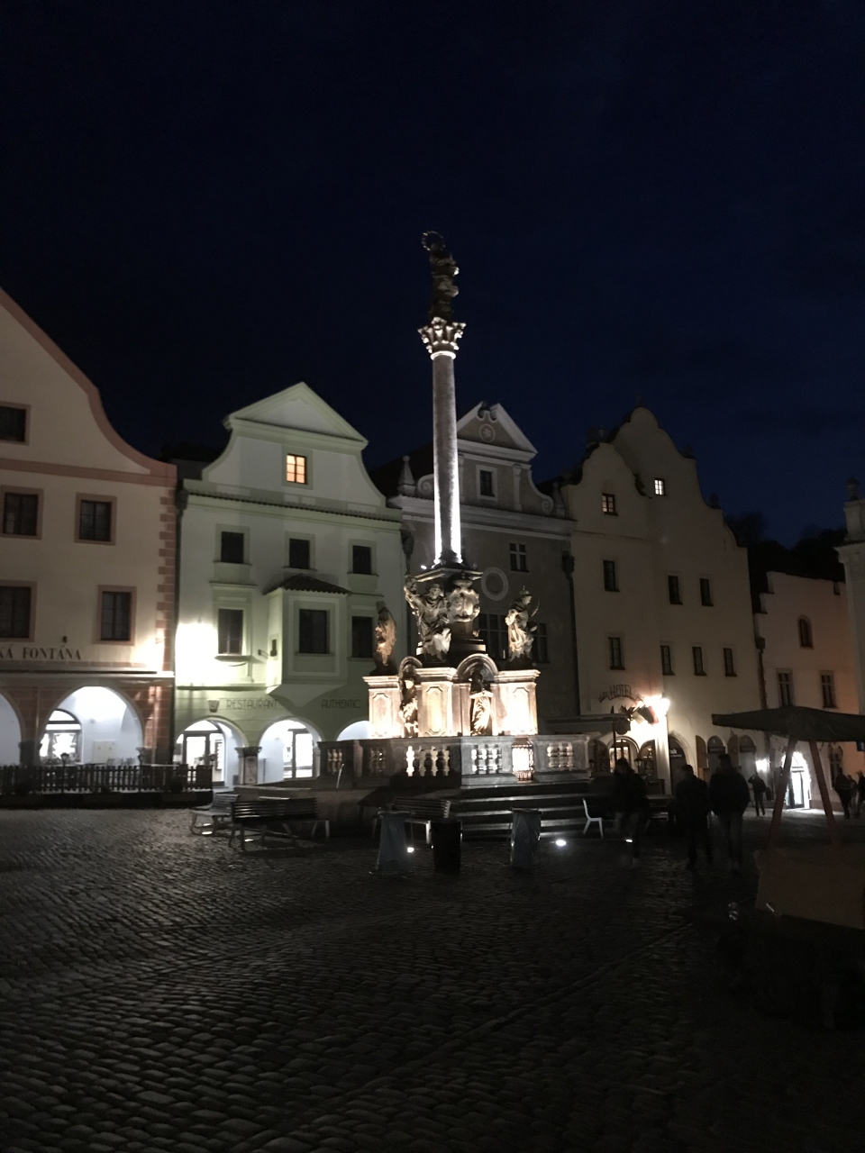 スヴォルノステイ広場の一角に建っています。塔には何体かの像が装飾されていますが、派手さは無く、シンプルな印象の像でした。塔の一番高い所にある像は、マリア像だそうです。夜はライトアップされていて、神秘的でした。