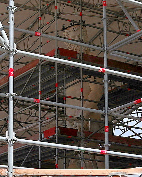 コジモ1世がオスマン帝国に対抗するために創設した海軍の力を誇示するため,長男フランチェスコとオーストリア皇女の結婚式に合わせて,アンマンナーティによって制作されたもの。訪問時は,大規模修繕のため,噴水全体がフェンスと屋根で覆われていました。コジモ1世の顔を模して彫刻され,「白い巨人」とあだ名された中央のネプチューンの像の周りも足場が組まれていました。