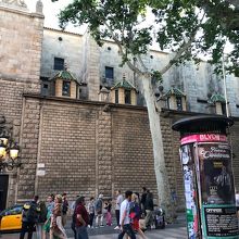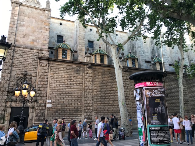 バルセロナでいちばん賑やかなランブラス通りを港の方へ向かって歩いて行くと右手に不思議な建物がありました。城壁のような感じでしたが、もうすこし先に行くと教会だとわかりました。結構な数の人が中に入って行くので、すこしだけのぞいてみました。スペイン内戦でかなり破壊されてしまったそうで、昔はバルセロナ一番の教会だったようです。