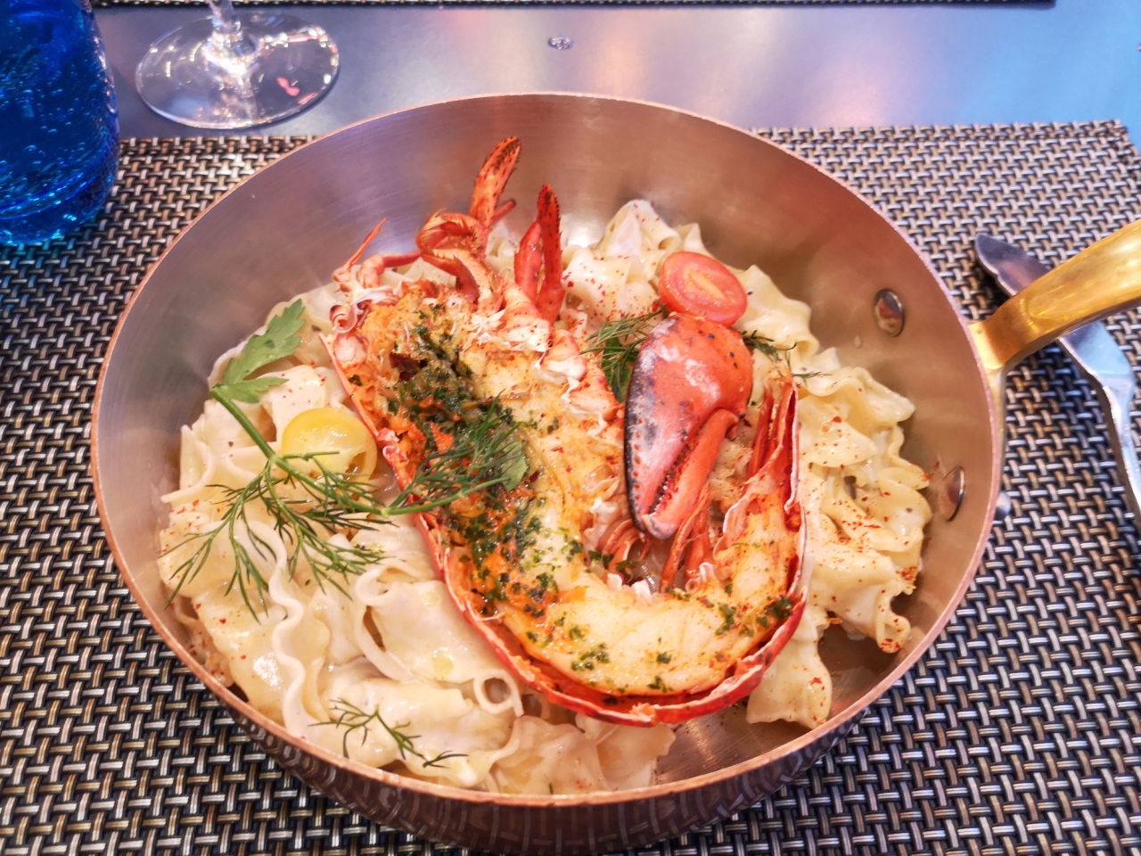 前菜で生牡蠣を頂き、メインにはロブスターのクリームパスタ。どちらも美味しく白ワインにベストマッチ。