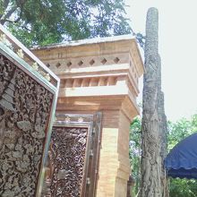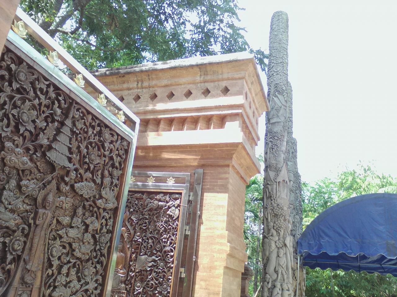 長い階段を上り、入口を入ってまず目につくのが左手にある古いレンガ積みの仏塔。そしてその前にイスに座った銅像が…。このお方は20世紀初頭までタイ北部を治めていたラーンナータイ王国の建国者メンラーイ王。仏塔には王の遺物が納められているようです。個人的なもう一つの見どころは敷地内に立っている木柱と入口の扉に彫られた彫刻です。近づいてよーく見るととても緻密ですごいものであることがよくわかります。