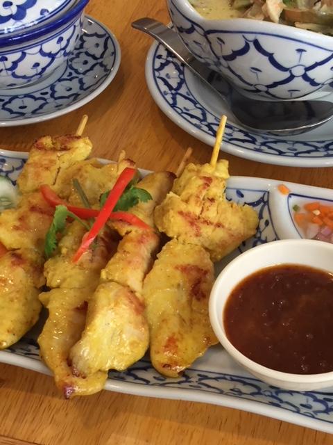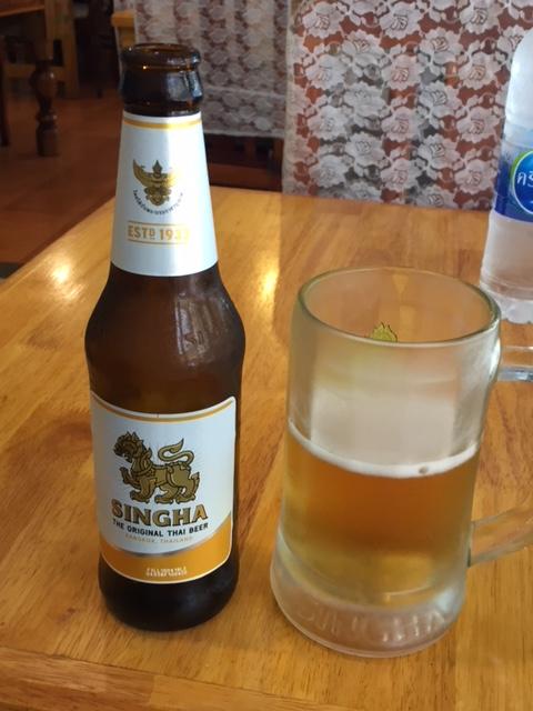 鶏肉のグリーンカレーと鶏肉サティ(=各写真)、ミネラル1本のセットを注文。お勧めのタイビールは? という質問に、イケメン君が「SINGHA」(=写真)と即答。当方も大きな声でsmallと。