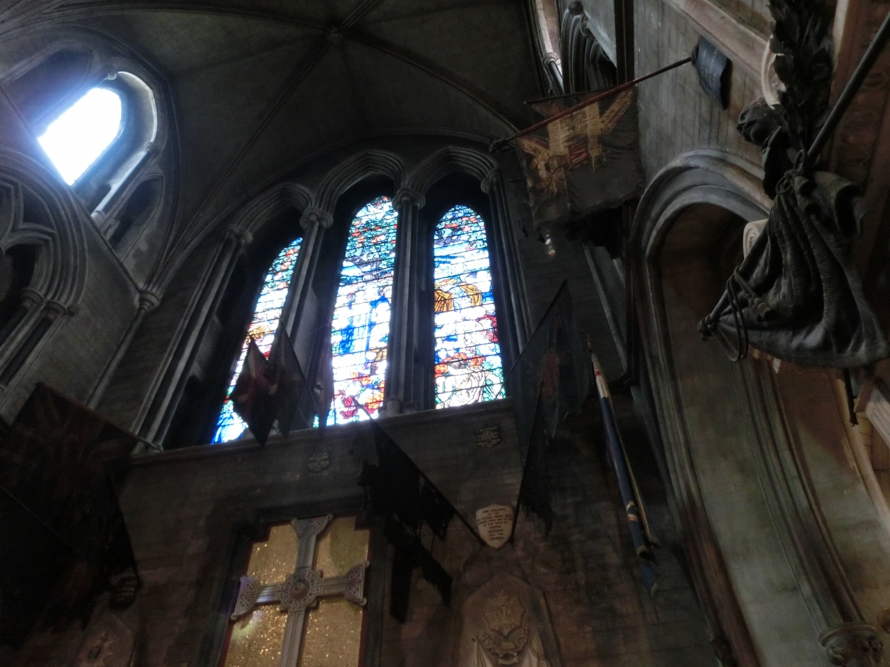 大聖堂の内部は、宗教施設という枠を超えて、ちょっとした博物館のように、アイルランドの歴史を物語る貴重な資料が数多く展示されています。建物奥の礼拝所は改修されて、新築当時の姿を思わせるような輝きを見せてくれますが、一方で、ふと天井の方を見上げると、逆に遥か昔から手付かずのままそこに掲げられていると思われるような旗が、すっかり黒ずんで今にも朽ち果てようとしている姿が見えたりもして、まるでこの大聖堂の中に封じ込められていたアイルランドの激動の歴史そのものが、心の中に流れ込んでくるような、そんな衝撃を感じました。見どころは建物内のあちこちに隠されているので、一応日本語のパンフレットも置かれてはいますが、ある程度予習してから訪れたほうがより一層楽しめるのではないでしょうか。