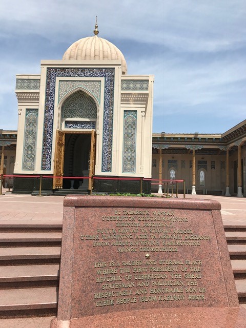 入場チケットは20,000スムでした(2019年5月現在)。ビビハニムモスクからアフラシアブの丘へ向かう途中にあります。小高い場所にあるのでビビハニムモスクやシヨブバアールを見渡せます。カリモフ前大統領のお墓がある場所として、現地の方はお祈りをささげにやってきます。絶大な信頼を集めていた大統領だったことが容易に伺えます。