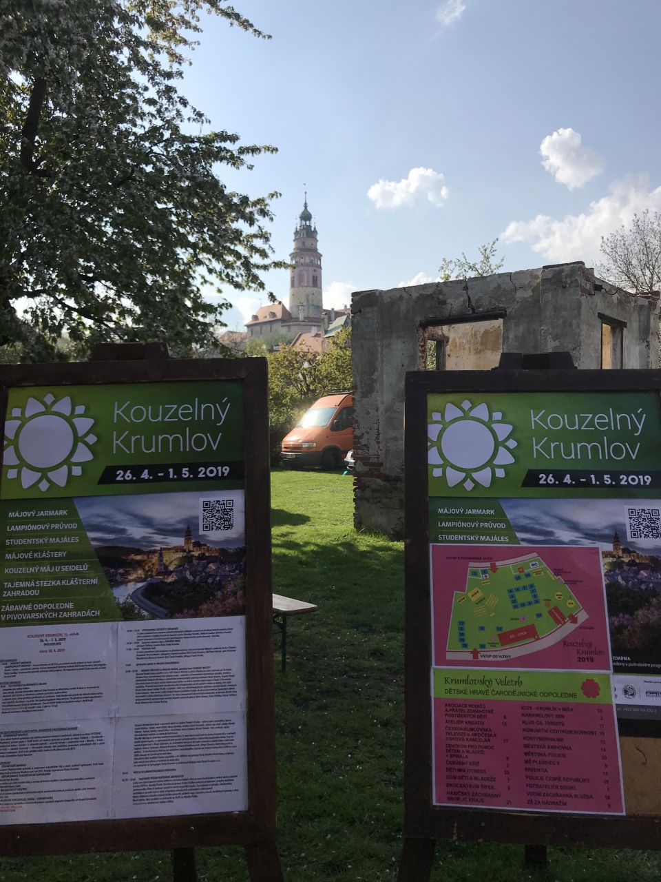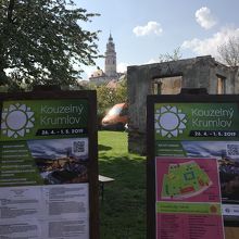 公園からは、チェスキークルムロフ城の塔と聖ヨスト教会が綺麗に見えます。