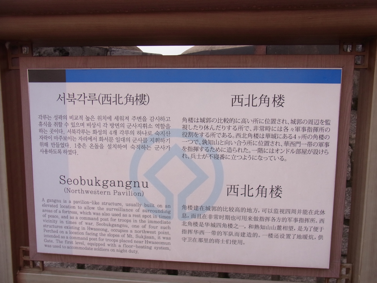 水原華城の城壁の途中にある建物で、板張りになっている内部へあがれるようになっていました。昔は軍事的な見張りなどに使用されていた建物のようでした。ここから城壁の外の市街地を一望できるので、ちょっとした休憩によかったです。